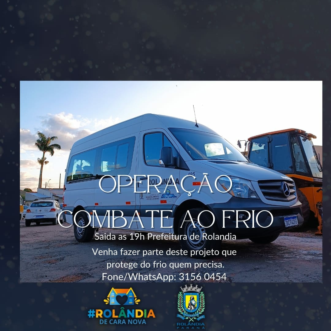OPERAÇÃO COMBATE AO FRIOA secretaria de Assistência Social começa, dentro de instantes, mais uma operação "Combate ao frio". Levando acolhimento, guarida, agasalhos e ajuda aos moradores de rua de Rolândia. Saída 19h....