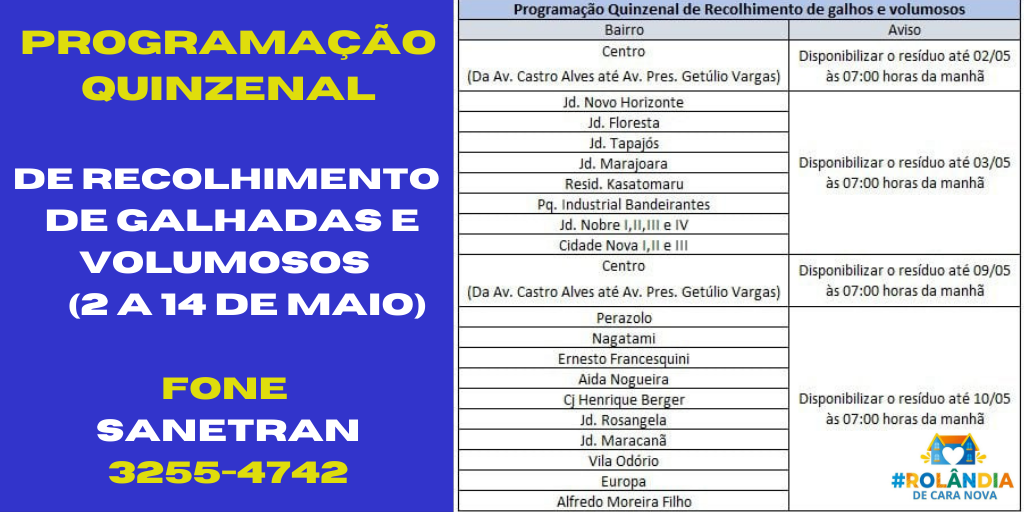 AGENDA DA SANETRAN PARA RECOLHER GALHADAS E VOLUMOSOSA Secretaria de Agricultura e Meio Ambiente informa que a empresa terceirizada que presta serviço ao município, a SANETRAN, dividiu a cidade em 14 regiões, sendo doze setores na área urbana e m...