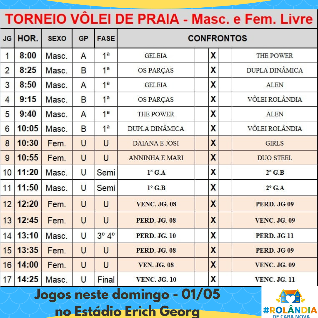SECRETARIA DE ESPORTES DIVULGA A TABELA DO TORNEIO DE "VÔLEI DE PRAIA", DO DIA DO TRABALHADORPartidas neste domingo, no Estádio Erich GeorgPrestigie!...