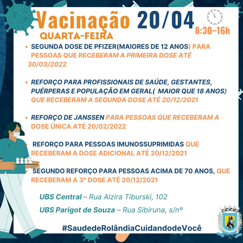 CONFIRA A AGENDA SEMANAL DE VACINAÇÃO CONTRA A COVID-19Na quinta, feriado nacional, não haverá oferta de vacina.Confira a convocação para os outros dias:...