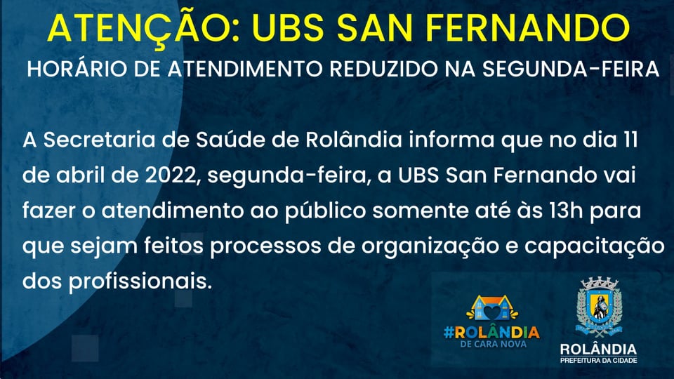 ATENÇÃO: UBS SAN FERNANDO HORÁRIO DE ATENDIMENTO REDUZIDO NA SEGUNDA-FEIRAA secretaria de Saúde de Rolandia informa que no dia 11 de abril de 2022, segunda-feira, a UBS San Fernando vai fazer o atendimento ao público somente até às 13h. Após,...
