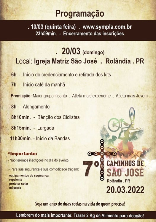 PASSEIO CICLÍSTICO "CAMINHOS DE SÃO JOSÉ" TEM INSCRIÇÕES ATÉ A PRÓXIMA QUINTA-FEIRAEm 20 de Março de 2022, Domingo, a partir das 8h, na praça da IGREJA MATRIZ SÃO JOSÉ, com o apoio da PREFEITURA MUNICIPAL DE ROLÂNDIA E SECRETARIA DE CULTU...