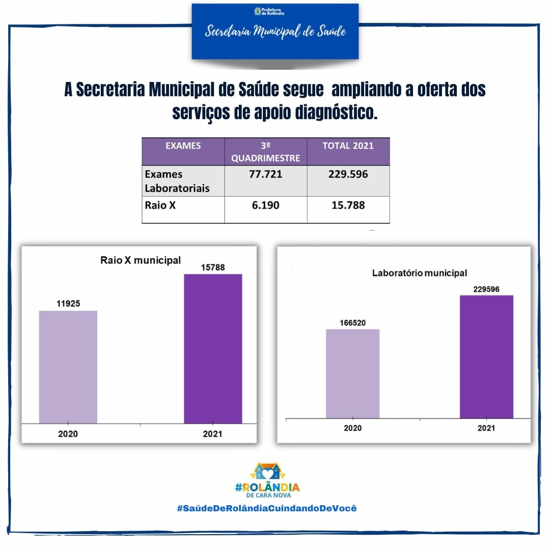A Saúde não pára, Rolândia! *VOCÊ SABIA QUE O LABORATÓRIO MUNICIPAL E O RAIO X, REALIZARAM MAIS DE 229.596 EXAMES E MAIS DE 15.788 RAIO X EM 2021* *DE SETEMBRO À DEZEMBRO DE 2021 FORAM REALIZADAS:* 77.721 Exames laboratoriais6.190 Raio ...