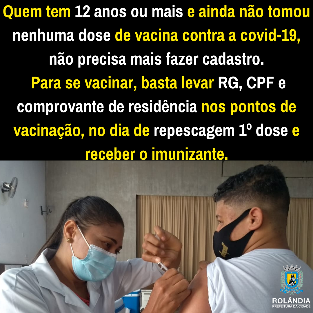 A secretaria de Saúde informa que, quem tem 12 anos ou mais e ainda não tomou nenhuma dose de vacina contra a covid-19, não precisa mais fazer cadastro. Basta levar RG, CPF e comprovante de residência nos pontos de vacinação, no dia de repescag...