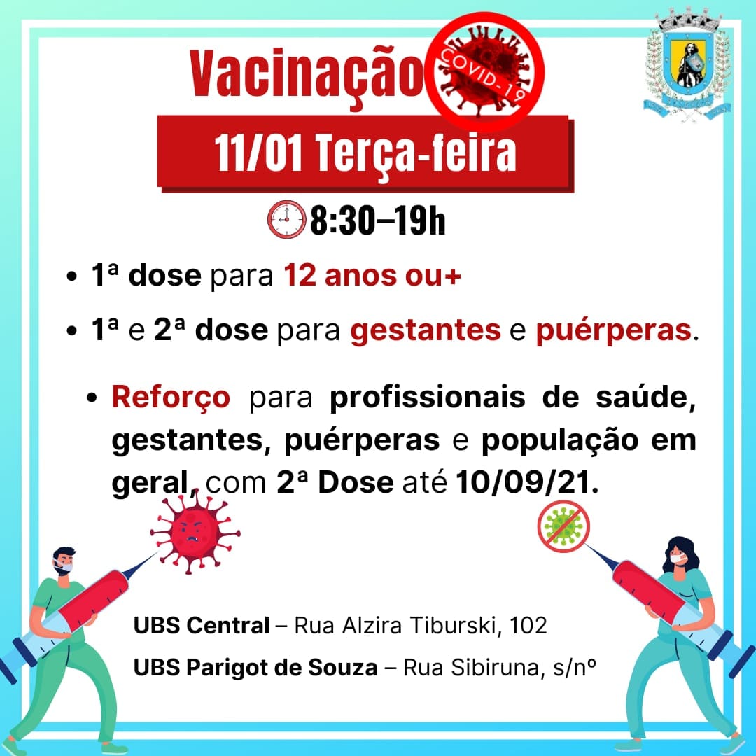 VACINAÇÃO COVID-19UBS CENTRAL E UBS PARIGOT CONFIRA NOSSA PROGRAMAÇÃO DE VACINA CONTRA COVID-19 PARA A PRÓXIMA SEMANA UBS CENTRAL E UBS PARIGOT Segunda -Feira-(10/01) das 08:30 às 16:00 horas*PRIMEIRA DOSE PARA PESSOAS DE 12 ANOS OU MAIS**PRIM...