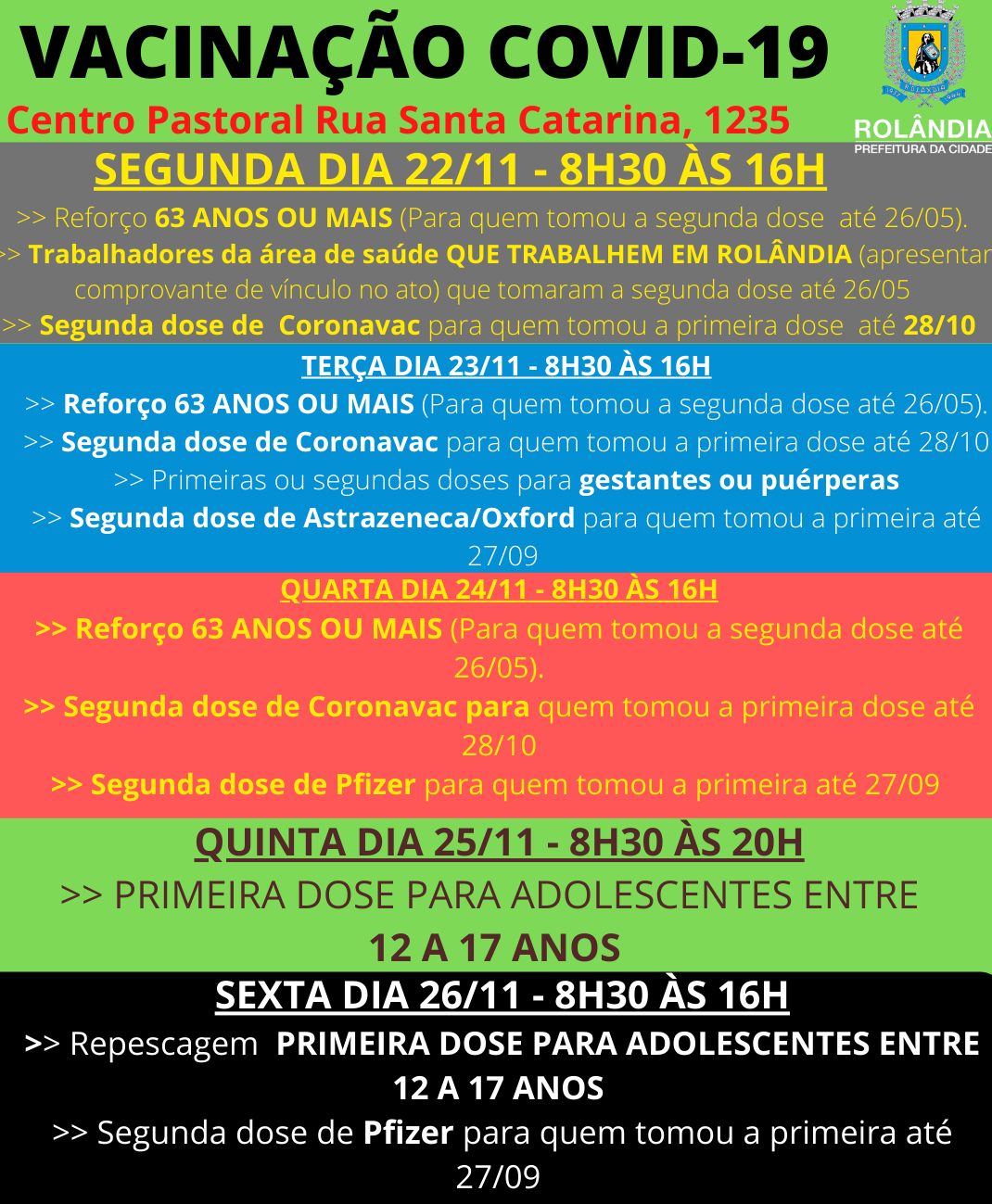 382 DOSES APLICADAS NESTA SEXTA; 2.430 ROLANDENSES FORAM VACINADOS CONTRA A COVID-19 AO LONGO DA SEMANA A Secretaria Municipal de Saúde informa que nesta semana foram aplicadas mais de duas mil doses contra a covid-19, em ação no Centro Pastoral,...