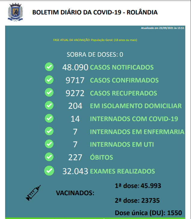 BOLETIM COVID-19 - 23/09/2021A Secretaria Municipal de Saúde informa sobre casos de covid-19.Nas últimas horas foram registrados 28 pacientes curados e 12 contaminações. Rolândia tem atualmente 218 pacientes com covid-19:204 em isolamento domic...