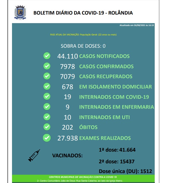 BOLETIM COVID-19 - 26/08/2021A Secretaria Municipal de Saúde informa sobre casos de covid-19: foram registradas 51 contaminações e 100 pacientes curados.Rolândia tem atualmente 697 pacientes com covid-19: 678 em isolamento domiciliar e 19 interna...
