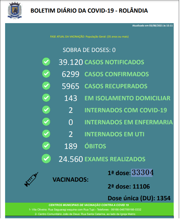 BOLETIM COVID-19A Secretaria Municipal de Saúde informa sobre casos de covid-19 nas últimas horas: foram registradas 31 contaminações e 18 pacientes curados. Rolândia tem atualmente 145 pacientes com covid-19, sendo 143 em isolamento domiciliar...