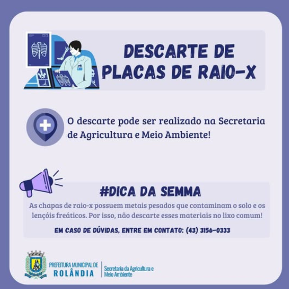 TEM PLACA DE EXAME DE RAIO-X E NÃO SABE ONDE DESCARTAR? Disponibilizamos local para recebimento e posterior descarte correto desses materiais. Descarte na Secretaria de Agricultura e Meio Ambiente! O endereço é Rua Santa...