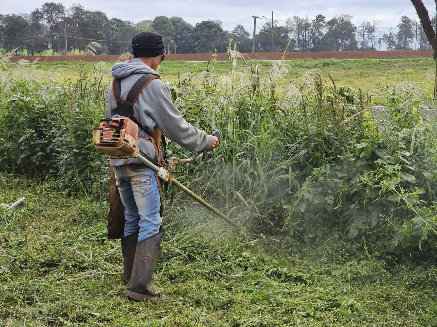Equipes das Secretarias de Infraestrutura e de Serviços Públicos promovem um grande mutirão de limpeza e roçagem na Avenida das Perobas, Gleba Três Bocas.
