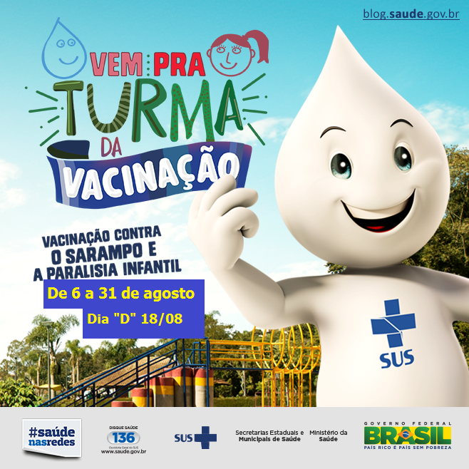 A Secretaria Municipal de Saúde informa que no mês de AGOSTO será realizada a Campanha Nacional de Vacinação contra a Poliomielite e contra o Sarampo: Período: de 06 a 31 de Agosto, sendo 18 de Agosto (sábado), o dia “D...