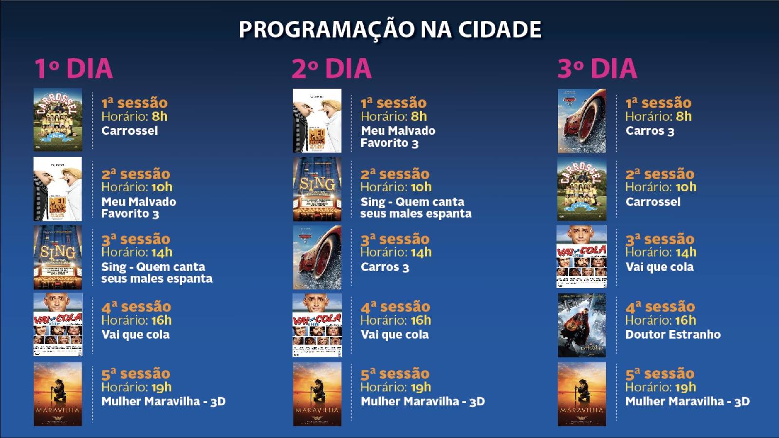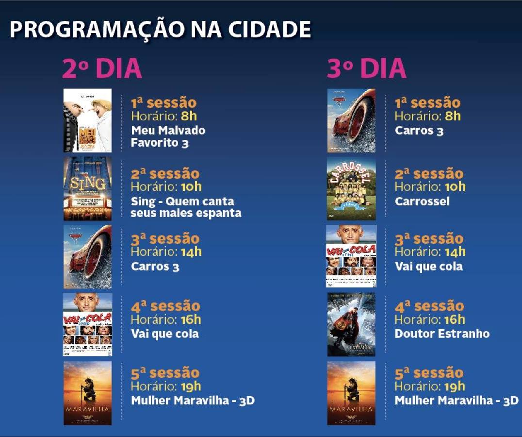 Depois do sucesso do primeiro dia, o segundo dia de cinema, pipoca e refri grátis promete ainda mais alegria e descontração: 8h Meu Malvado Favorito 310h Sing - quem canta seus males espanta14h Carros 316h Vai que cola19h Mulher Mar...