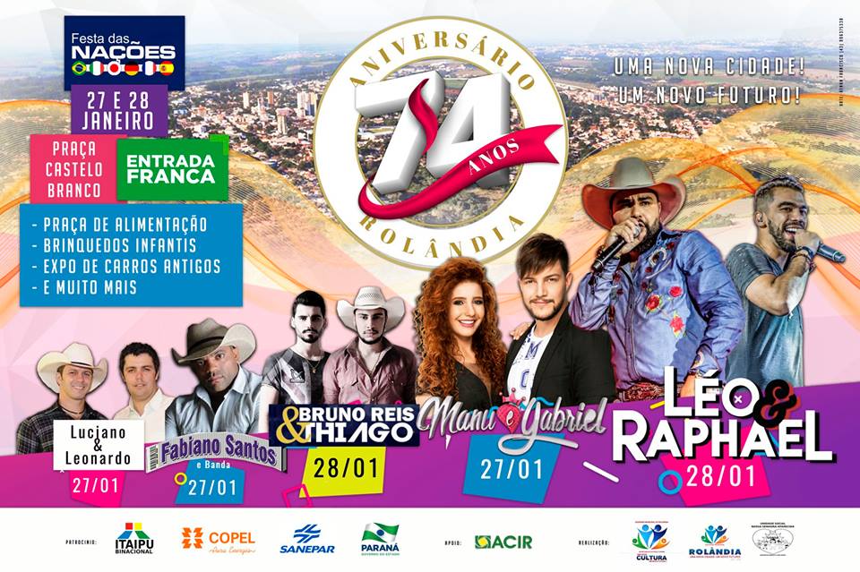 Você, sua família e seus amigos estão convidados para festejar os 74 anos de Rolândia! As comemorações serão no sábado (27 de janeiro) e domingo (28 de janeiro), na Praça Castelo Branco, área central, com entrada franca. No sábad...