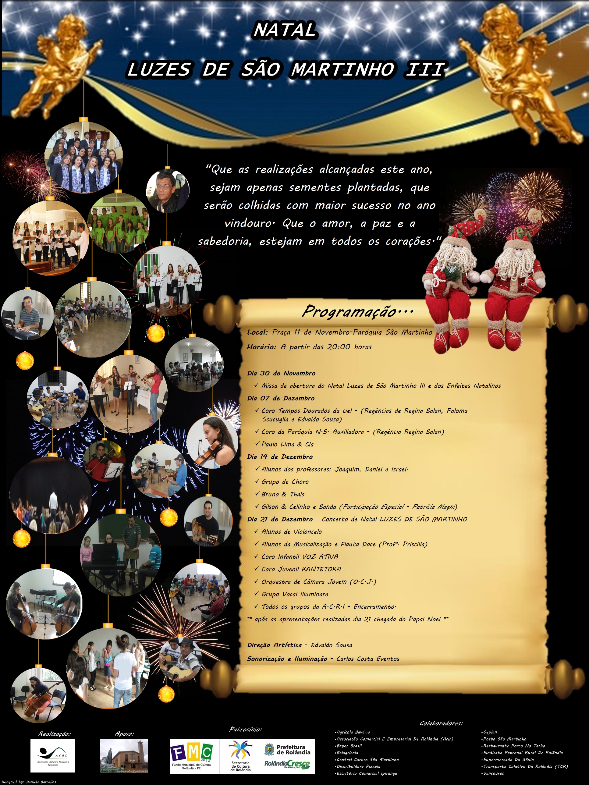As apresentações artísticas acontecem sempre às 20 horas na Praça 11 de novembro, em frente à paróquia de São Martinho. Veja programação em anexo. O evento tem patrocínio do Fundo Municipal de Cultura, da Secretaria de Cultura e da Prefe...