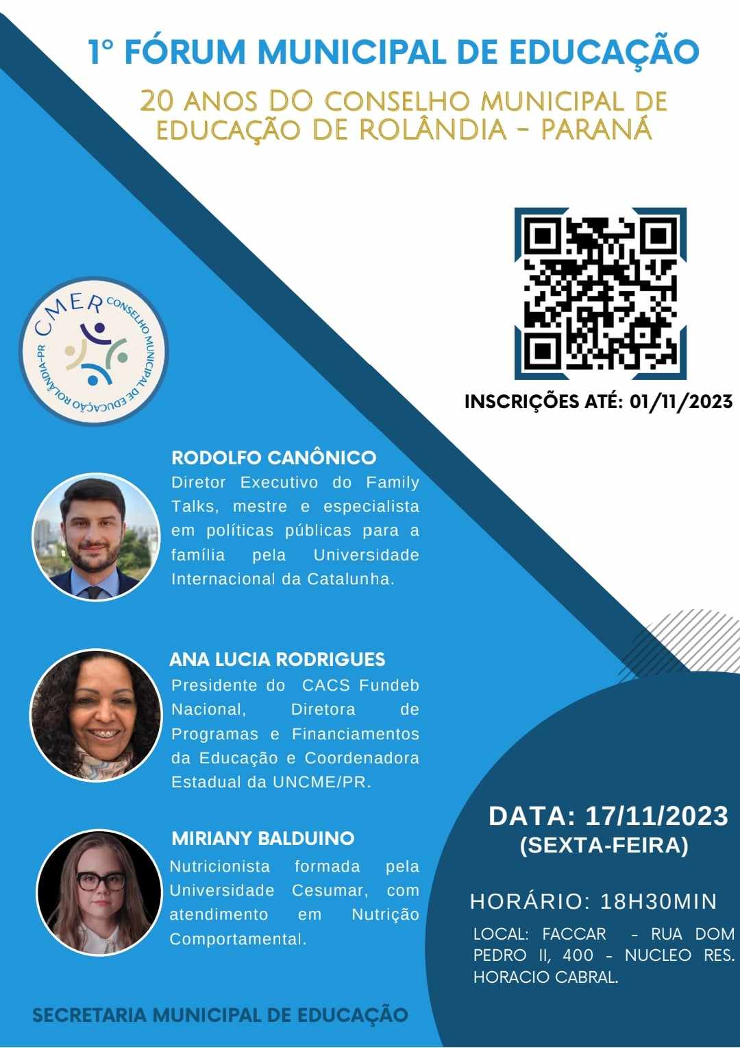 CONVITE "1° FÓRUM MUNICIPAL DE EDUCAÇÃO"É com grande satisfação que a secretaria de Educação convida para o "1° FÓRUM MUNICIPAL DE EDUCAÇÃO", em comemoração aos 20 anos do Conselho Municipal de Educação de Rolândia.O evento é abert...