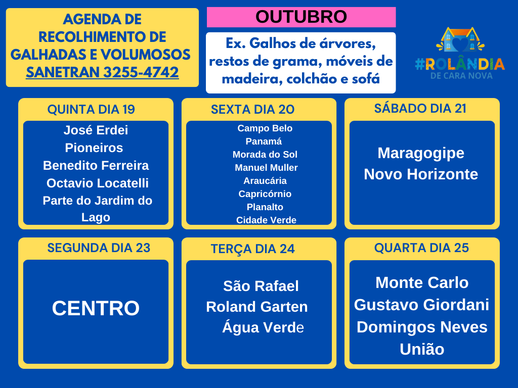 AGENDA DA SANETRAN PARA RECOLHER GALHADAS E VOLUMOSOS As Secretarias de Serviços Públicos e de Agricultura e Meio Ambiente informam que a empresa terceirizada que presta serviço ao município, a SANETRAN, faz a divulgação das regiões em que vai...