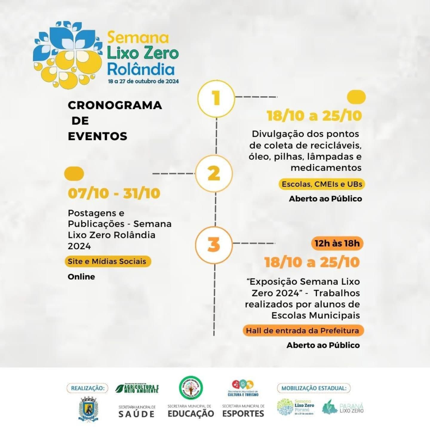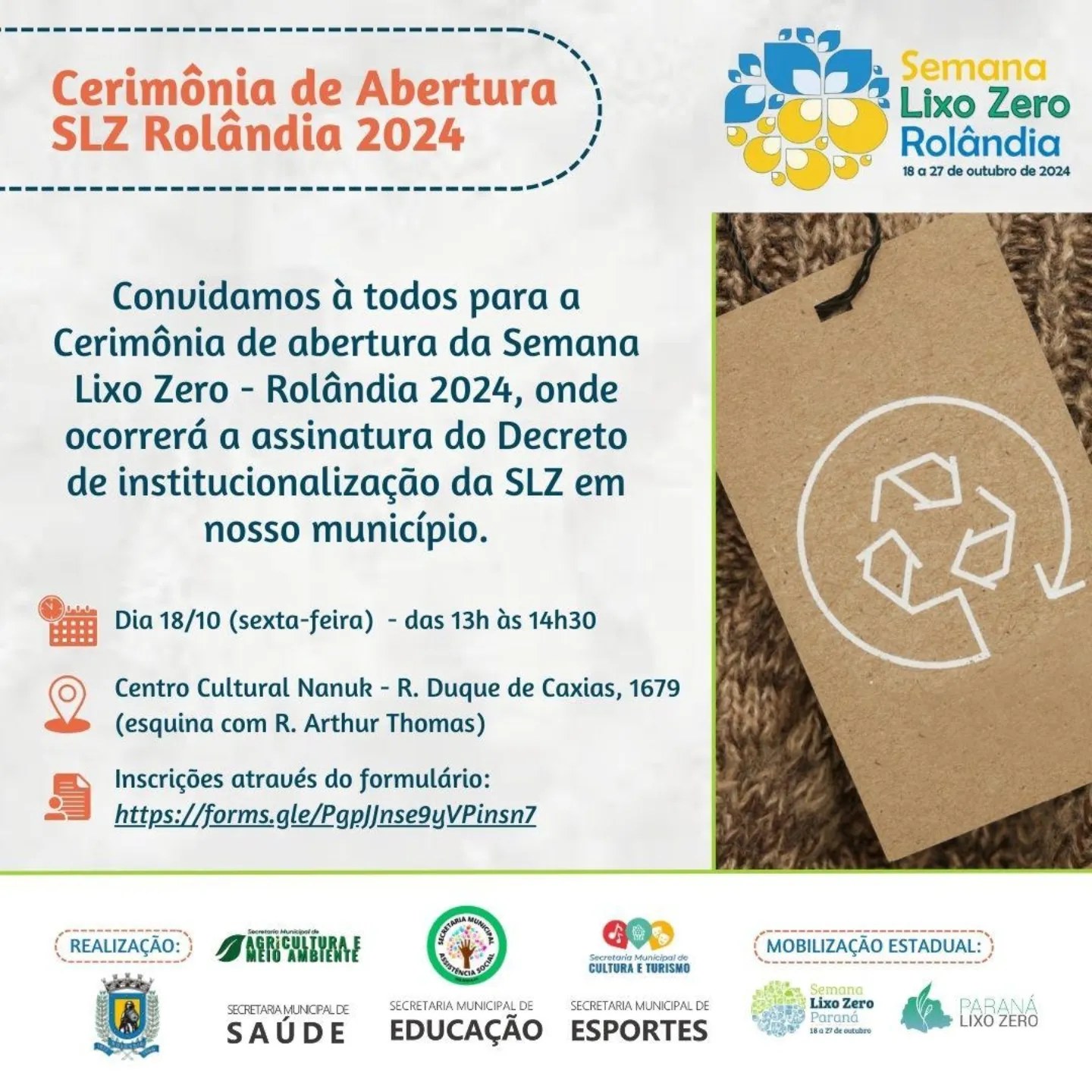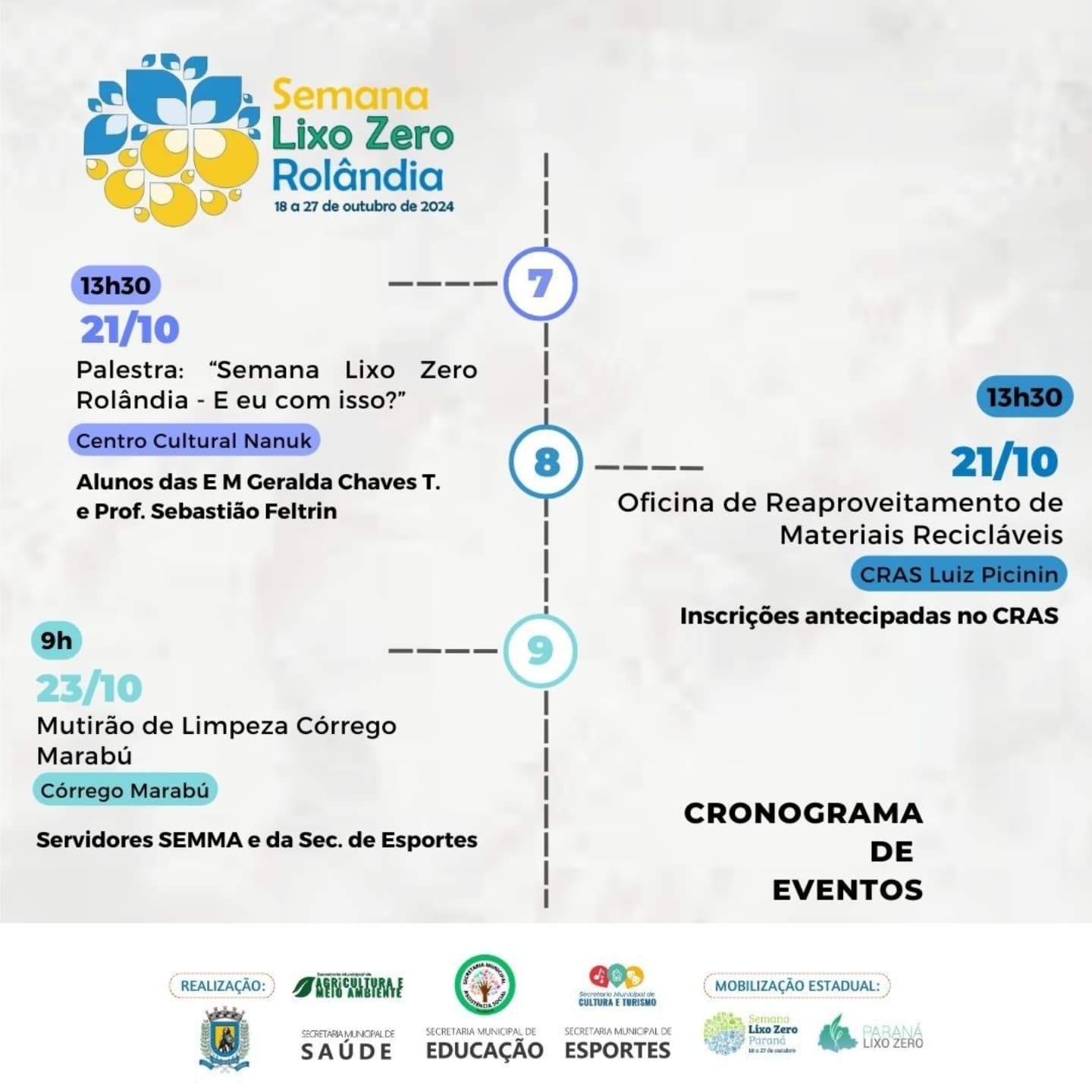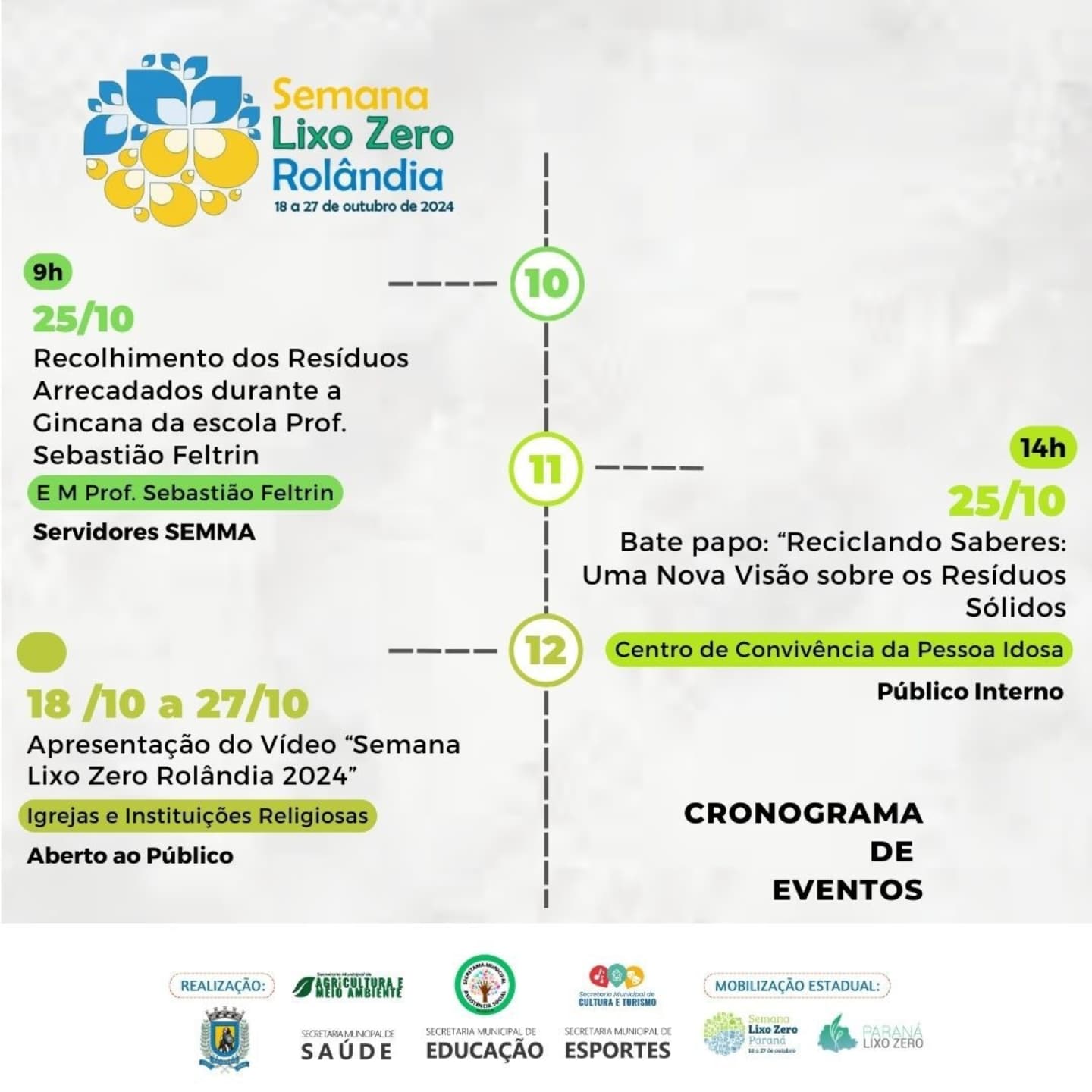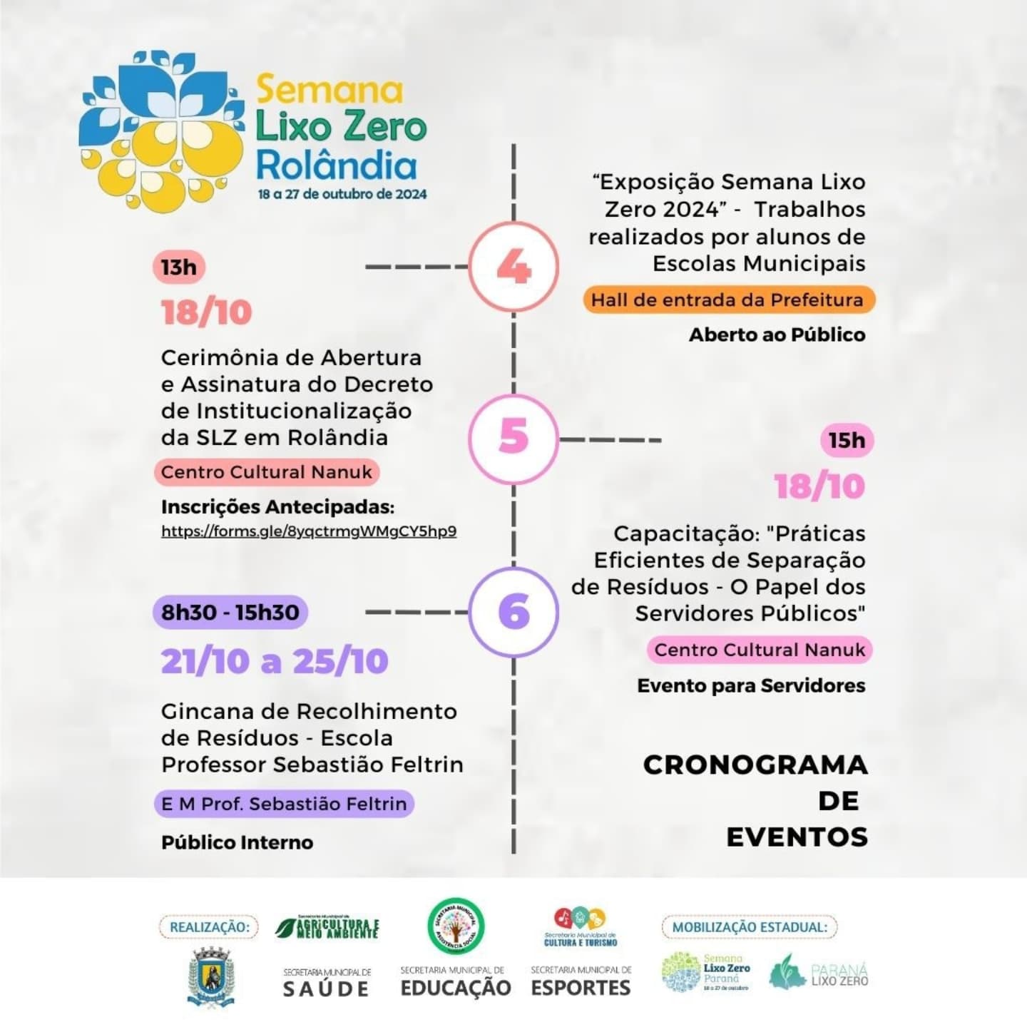 De 18 a 25 de outubro, Rolândia desenvolve a “Semana Lixo Zero (SLZ)”. O trabalho educativo visa conscientizar a população sobre a importância do descarte correto de lixo, separar os resíduos e cuidar do meio ambiente.