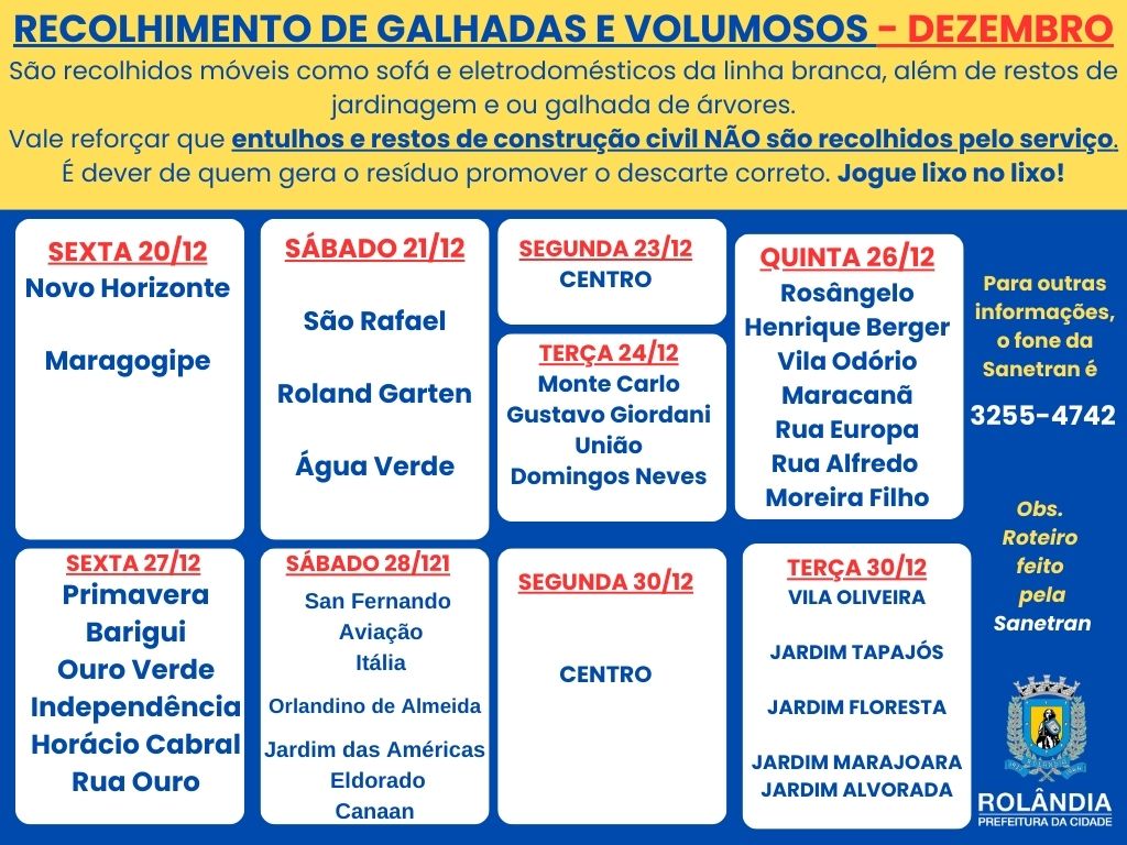 As Secretarias de Serviços Públicos e de Agricultura e Meio Ambiente informam que a empresa terceirizada que presta serviço ao município, a SANETRAN, faz a divulgação das regiões em que vai passar recolhendo volumosos deixados na calçada (móveis como sofá e eletrodomésticos da linha branca), além de restos de jardinagem e ou galhada de árvores.