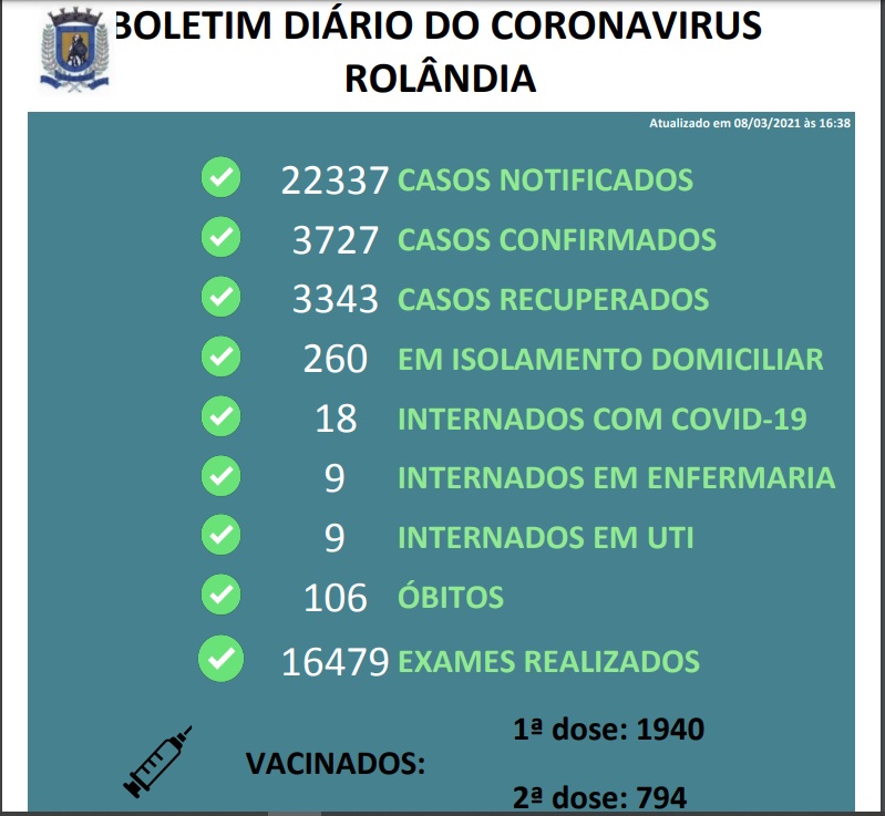 A Secretaria Municipal de Saúde de Rolândia informa sobre os casos de covid-19 na cidade. Em relação ao último levantamento, tem-se os seguintes números:Novos casos registrados: 76Total de casos registrados: 3.727Pacientes em isolamento domicil...
