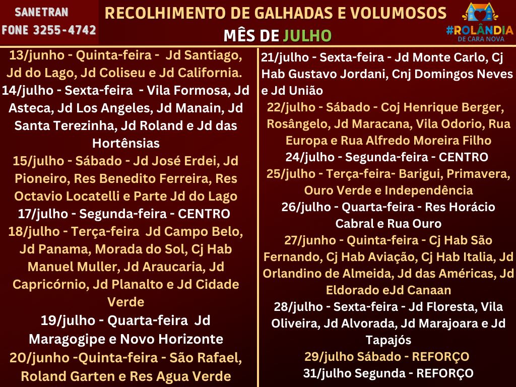 AGENDA DA SANETRAN PARA RECOLHER GALHADAS E VOLUMOSOS -JULHOA Secretaria de Agricultura e Meio Ambiente informa que a empresa terceirizada que presta serviço ao município, a SANETRAN, faz a divulgação das regiões em que vai passar recolhendo vol...