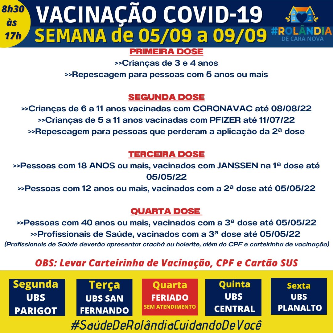 PROGRAMAÇÃO VACINAS COVID-1905 a 09 de setembro de 2022 2ª feira UBS PARIGOT DE SOUZA (Rua Sibiruna, 330 - Fone: 3906-1110) 3ª FEIRA UBS SAN FERNANDO (Av Francisco Serpeloni, 715 - Fone: 3255-1757) 4ª FEIRA FERIADO 5ª FEIRA UBS CENT...
