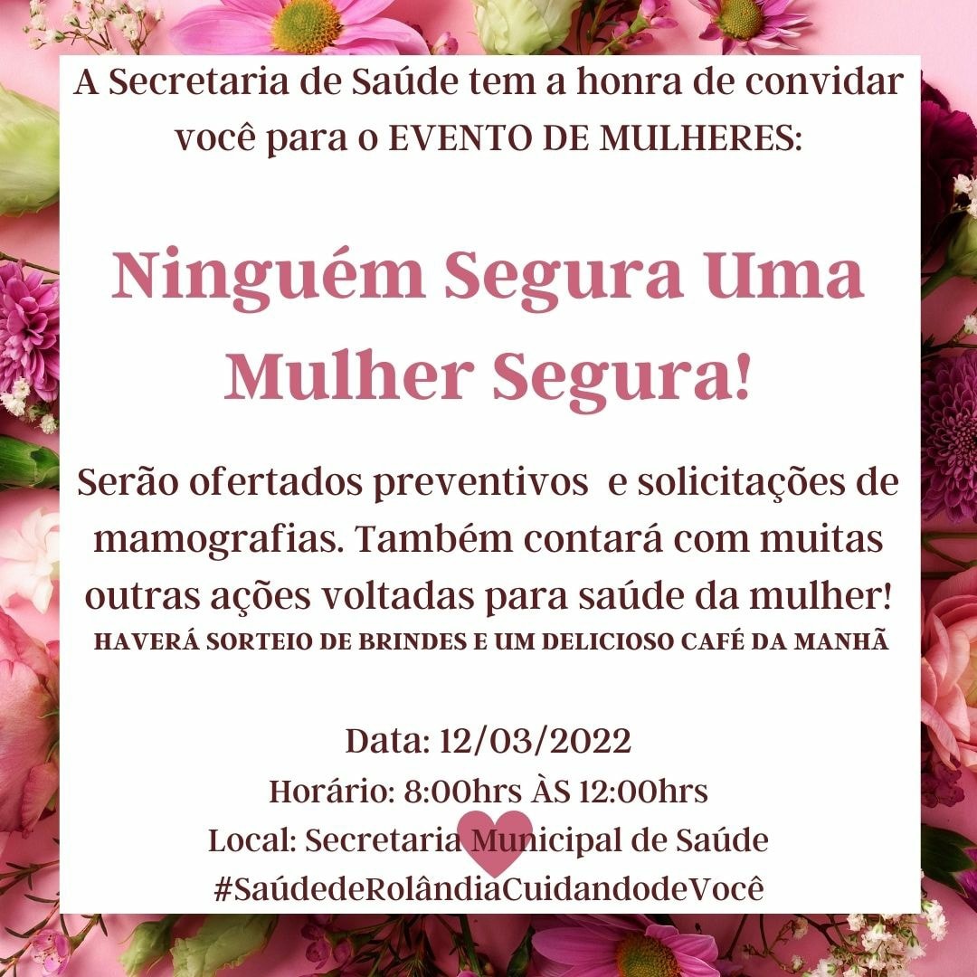 *ATENÇÃO MULHERES!* *Recado da Secretaria Municipal de Saúde de Rolândia* Na semana do *dia internacional da mulher*, a Secretaria de Saúde realizará um evento para mulheres:*NINGUEM SEGURA UMA MULHER SEGURA!!!!* *12 de março* *8:00 às 12:...