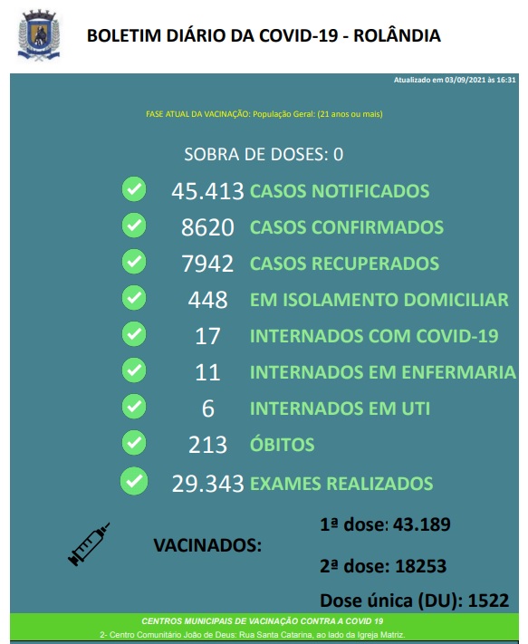 BOLETIM COVID-19 - 03/09/2021 A Secretaria Municipal de Saúde informa sobre casos de covid-19. Nas últimas horas foram registrados 143 pacientes curados e 116 contaminações.Rolândia tem atualmente 465 pacientes com covid-19: 448 em isolam...