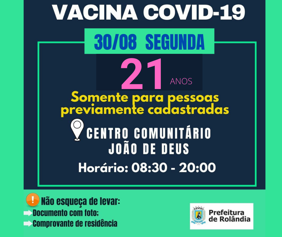NESTA SEGUNDA-FEIRA (30/08) TEM PRIMEIRA DOSE CONTRA A COVID-19 PARA PESSOAS DE 21 ANOS NO CENTRO PASTORAL JOÃO DE DEUSDAS 8h30 ÀS 20 HORAS30/08 (Segunda-feira)8h30 às 20 horas Centro Pastoral João de Deus - ao lado da Igreja Matriz*EXCLUSIVAM...