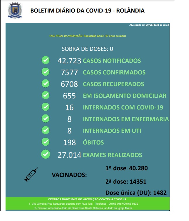 BOLETIM COVID-19A Secretaria Municipal de Saúde informa sobre casos de covid-19 nas últimas horas: foram registradas 196 contaminações e 158 pacientes curados.Rolândia tem atualmente 671 pacientes com covid-19: 655 em isolamento domiciliar e 16 ...