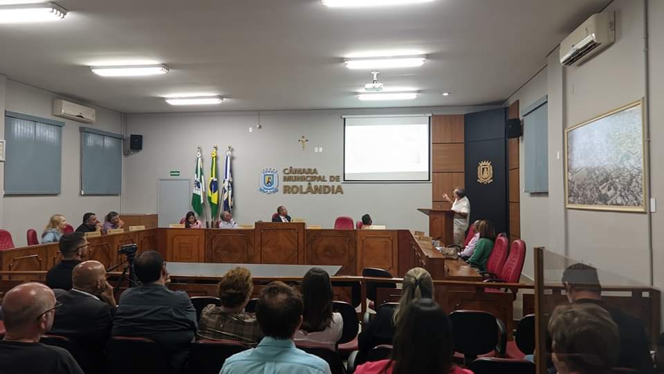 O prefeito Ailton Maistro, a primeira-dama Ana Maria Mungo Maistro, o procurador Geral, Wilson Socio Júnior, o secretário de Planejamento Zeca Salgueiro, a secretária de Educação, Leise Camargo e o secretário de Esportes, Odyr Polaco acompanharam na noite desta quinta-feira (25), uma audiência pública realizada pela Comissão Especial Mista de Revisão do Plano Diretor de Rolândia (CEM - PD).