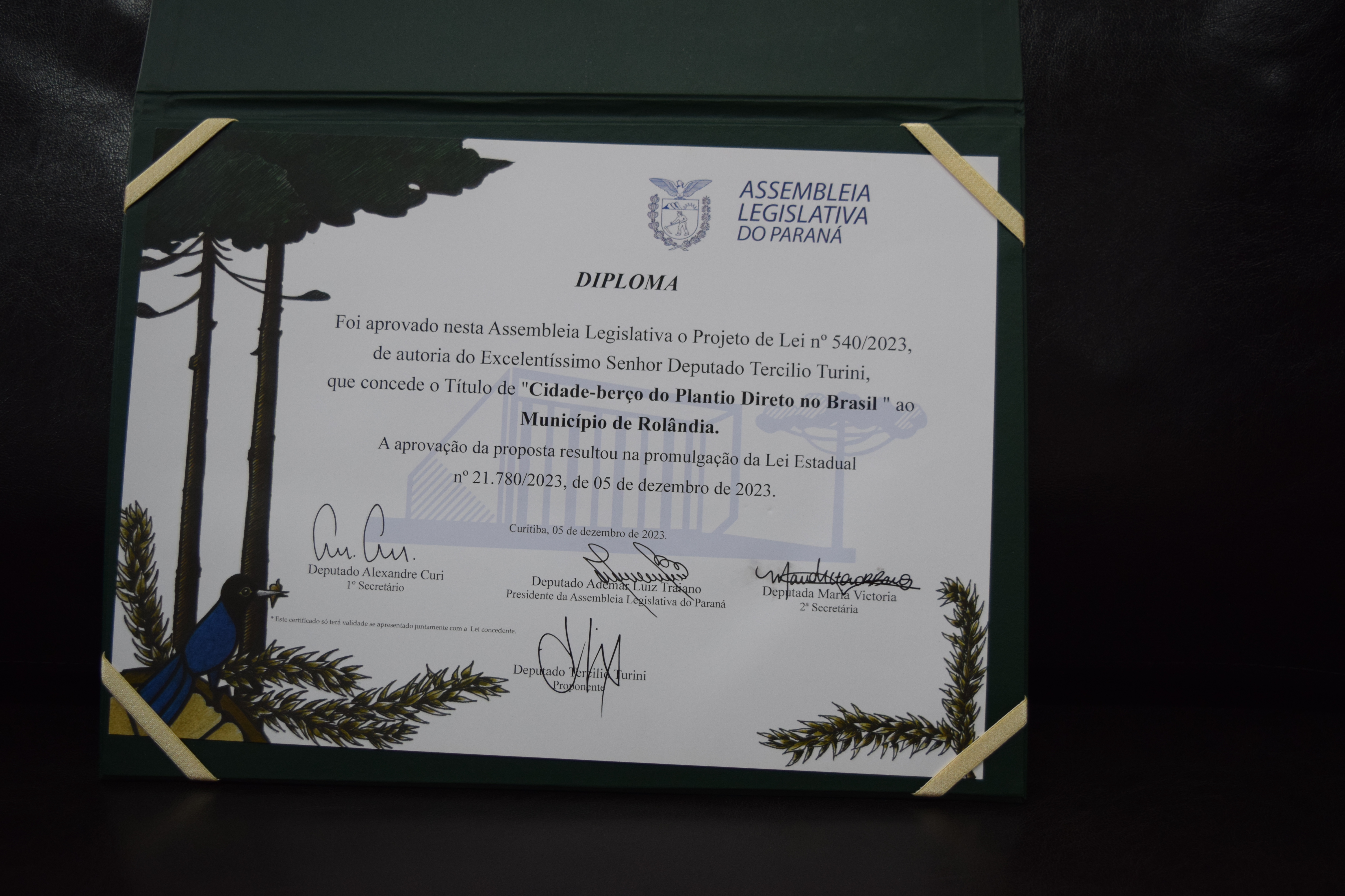 A cidade de Rolândia agora é a “Cidade-Berço do Plantio Direto no Brasil”, título dado por meio da lei estadual nº 21.780/2023, de autoria do deputado estadual Tercílio Turini (PSD), e aprovada pela Assembléia Legislativa do Paraná.