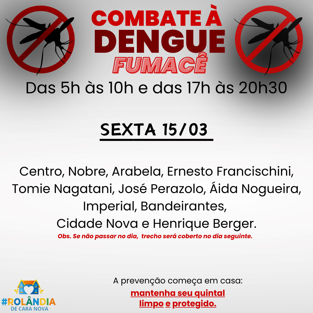 A secretaria municipal de Saúde comunica que os veículos aspergindo o fumacê vão passar em dois horários nesta sexta-feira – 15/03, das 5h às 10h e das 17h às 20h30.