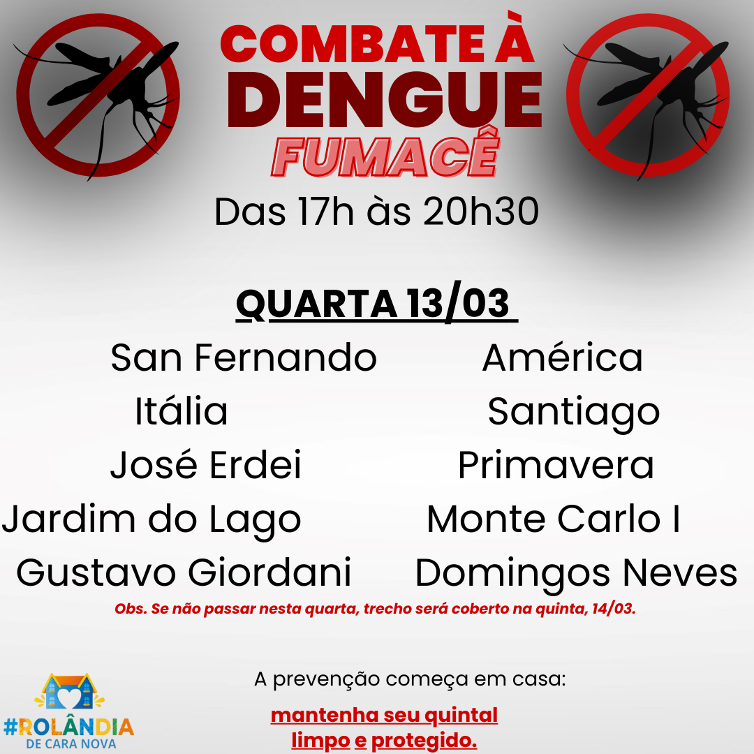 A secretaria municipal de Saúde comunica que os veículos aspergindo o fumacê vão passar em dois horários nesta quinta-feira – 14/03, das 5h às 10h e das 17h às 20h30.