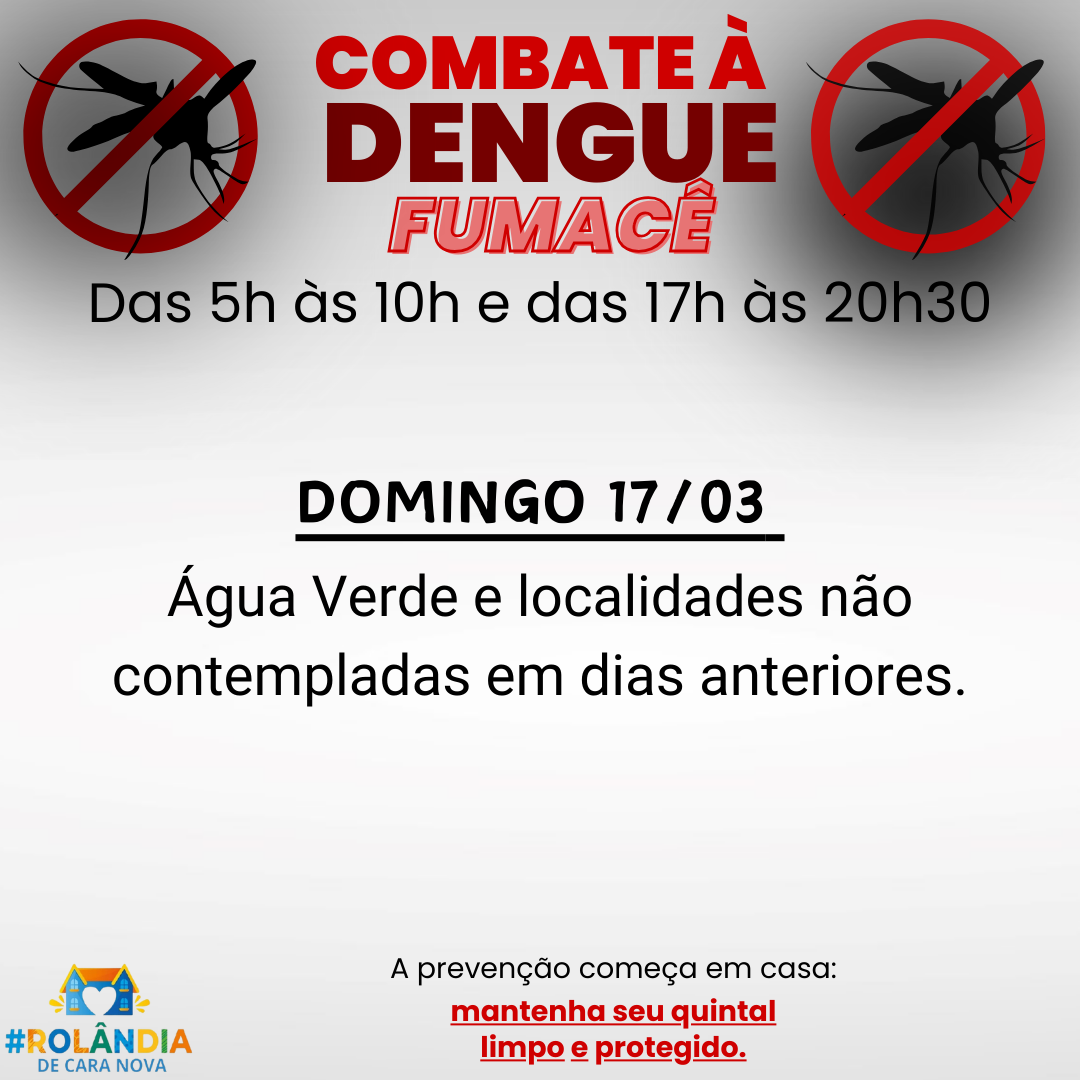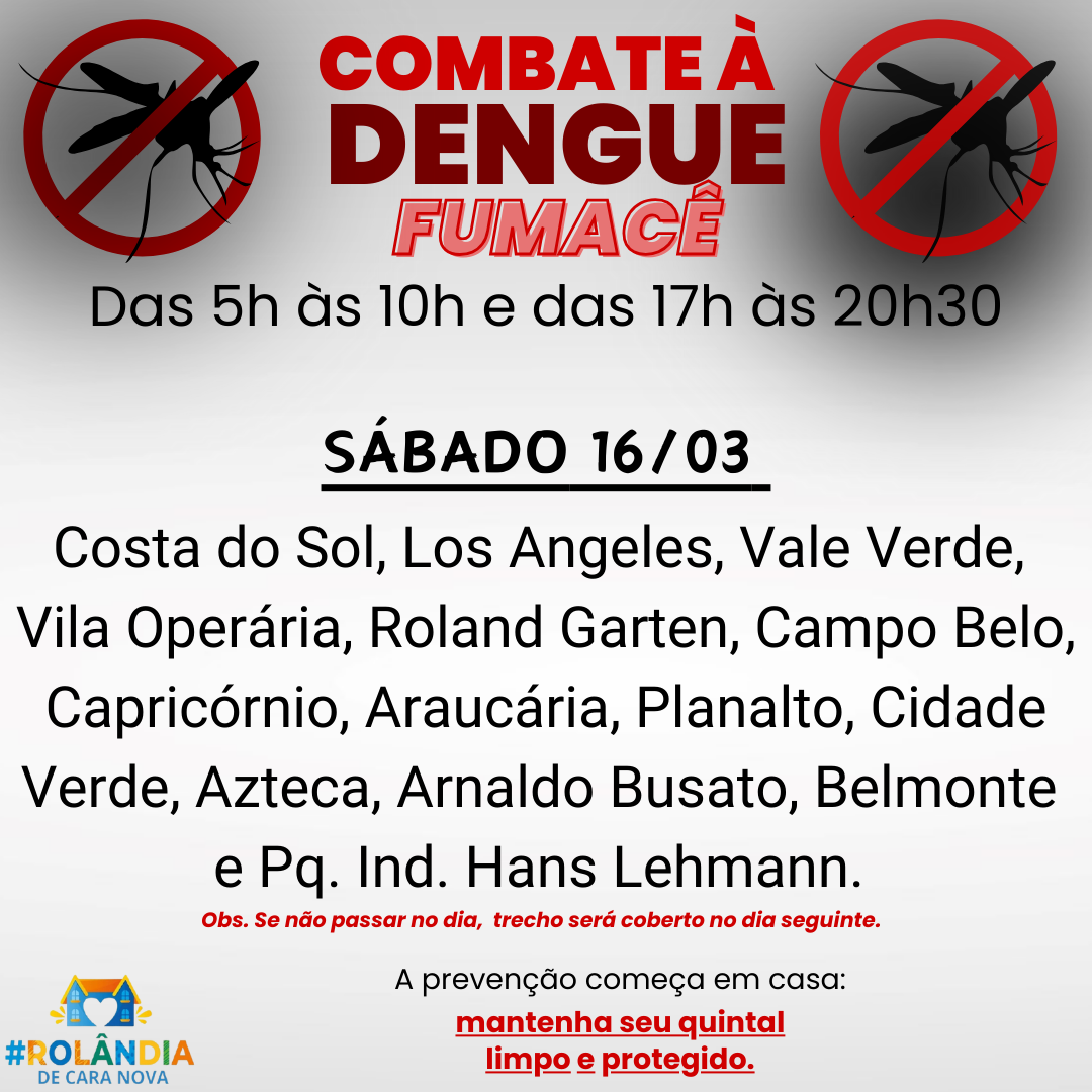 A secretaria municipal de Saúde comunica que os veículos aspergindo o fumacê vão passar em dois horários neste sábado – 16/03, das 5h às 10h e das 17h às 20h30.