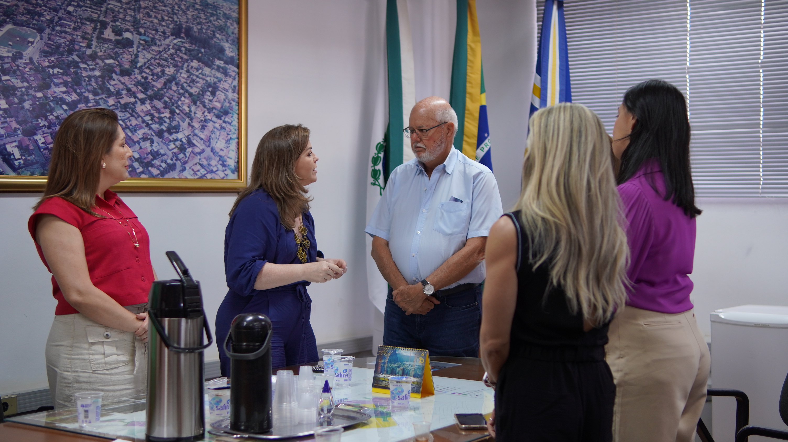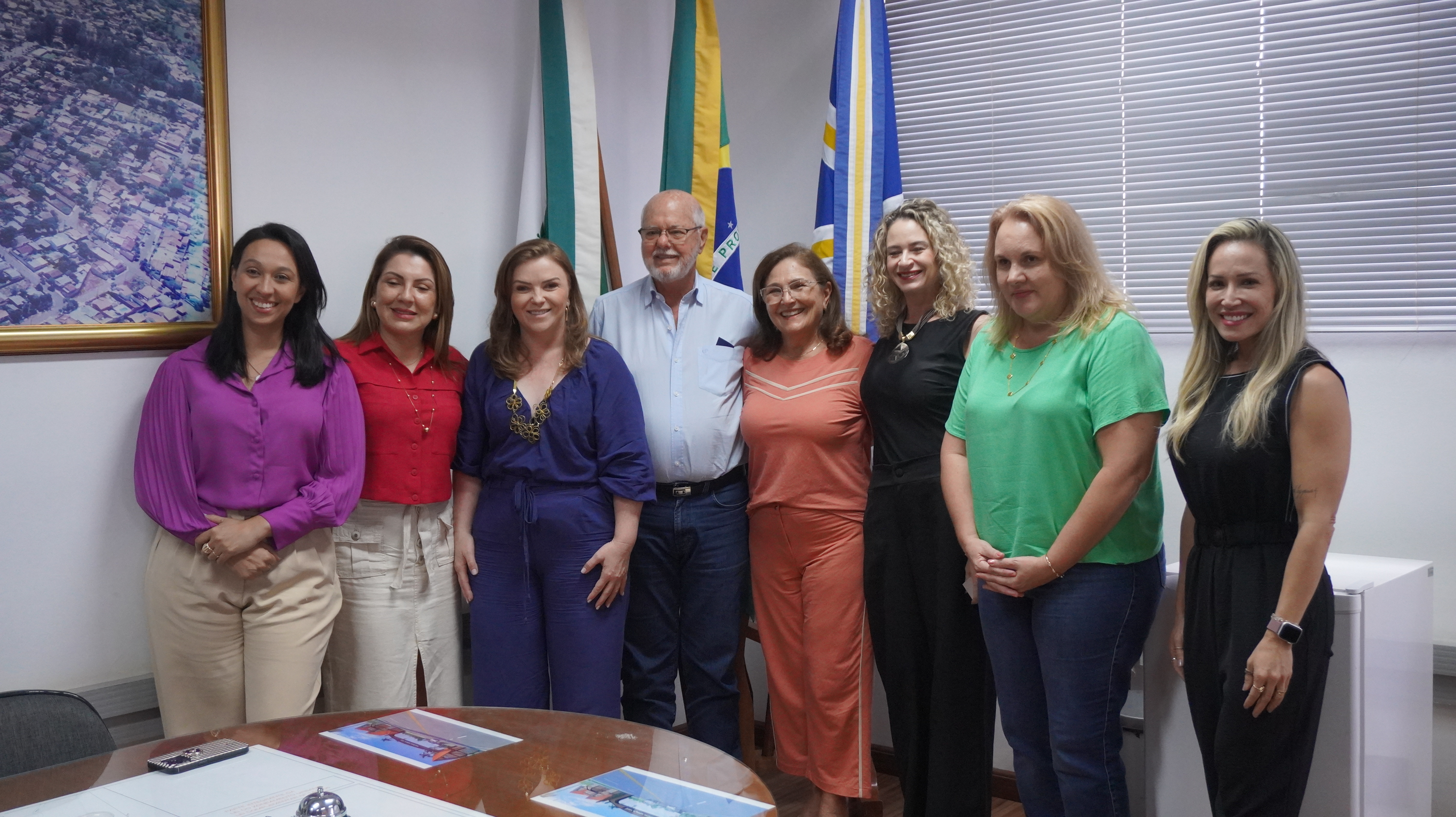 O prefeito Ailton Maistro, a primeira-dama Ana Maria Mungo Maistro, a secretária de Assistência Social, Michele Pereira, a vereadora líder do prefeito e procuradora da Mulher na Câmara, Cristina Pieretti, a vereadora professora Janaína Benelli, a diretora de Políticas Públicas Para Mulheres de Rolândia, Viviane Vernillo receberam as visitas da secretária de Leandre Dal Ponte, assessora executiva da Casa Civil do Paraná, Deise Vieira Tokano Ubiratã.