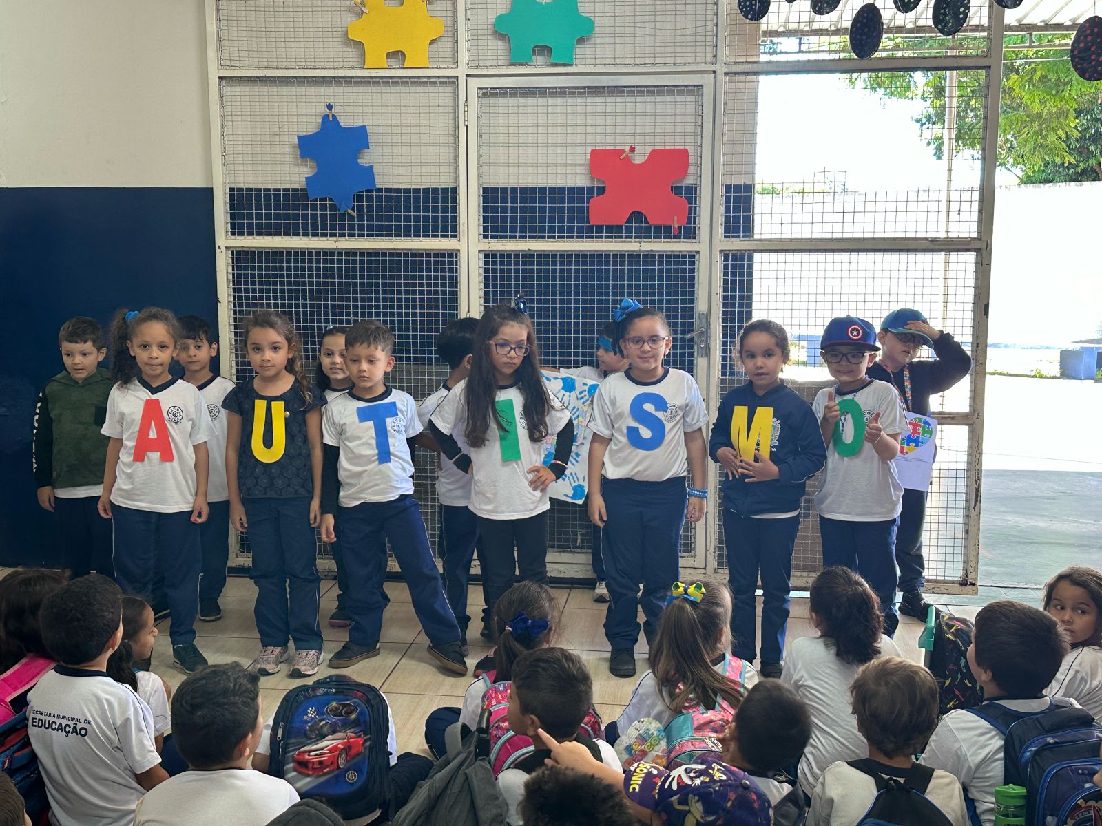 As turmas da educação infantil fizeram uma belíssima apresentação aos demais alunos, mostrando as características e símbolos do autismo.