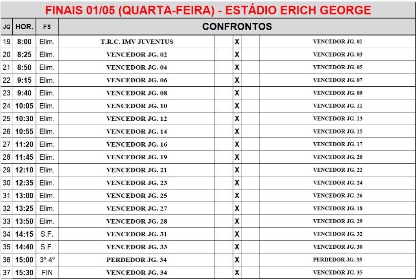 Todos os jogos serão da fase eliminatória, dia 28 de abril e as finais que definirão o campeão e vice acontecem no dia 1º de maio também no estádio municipal.