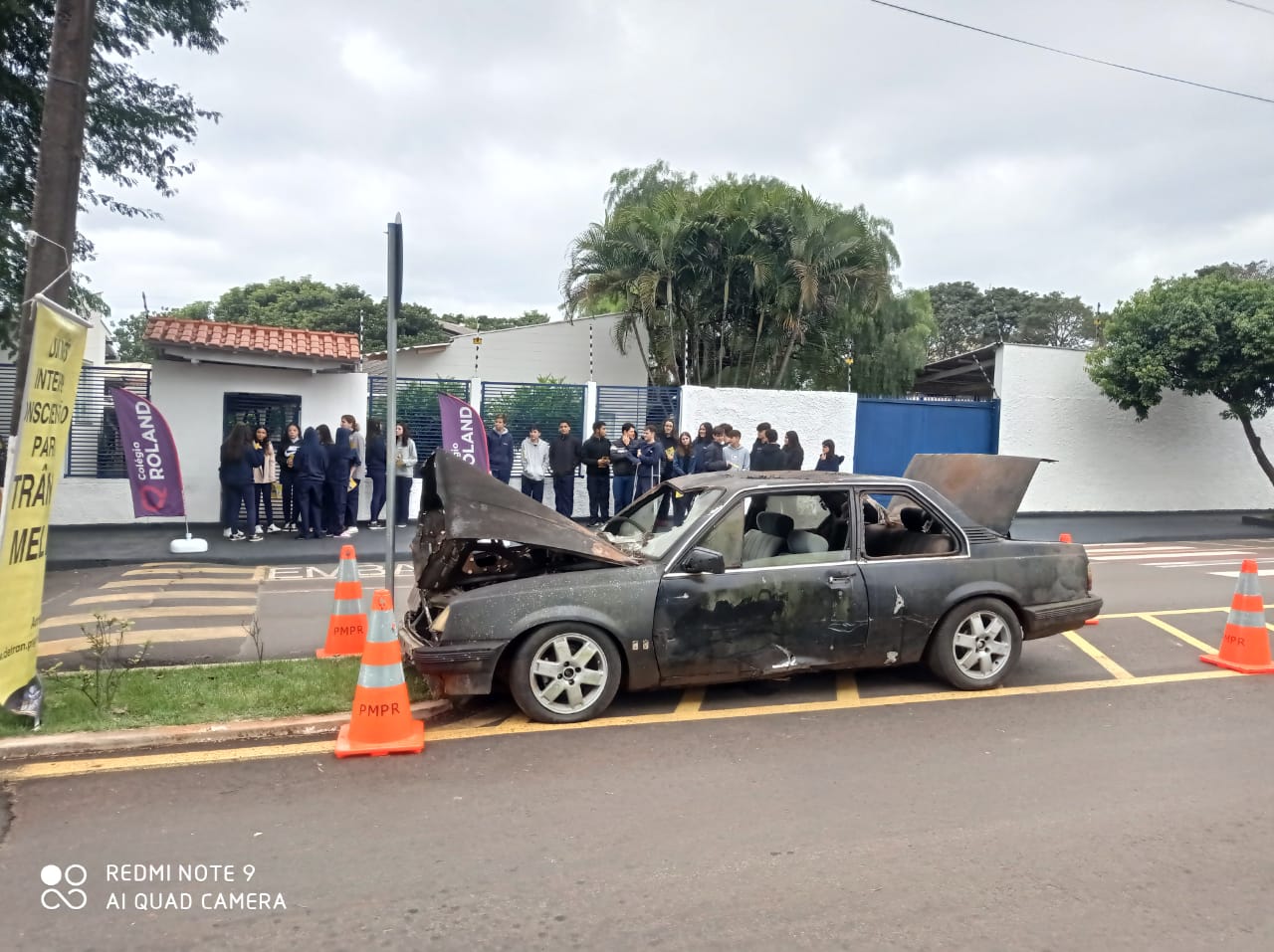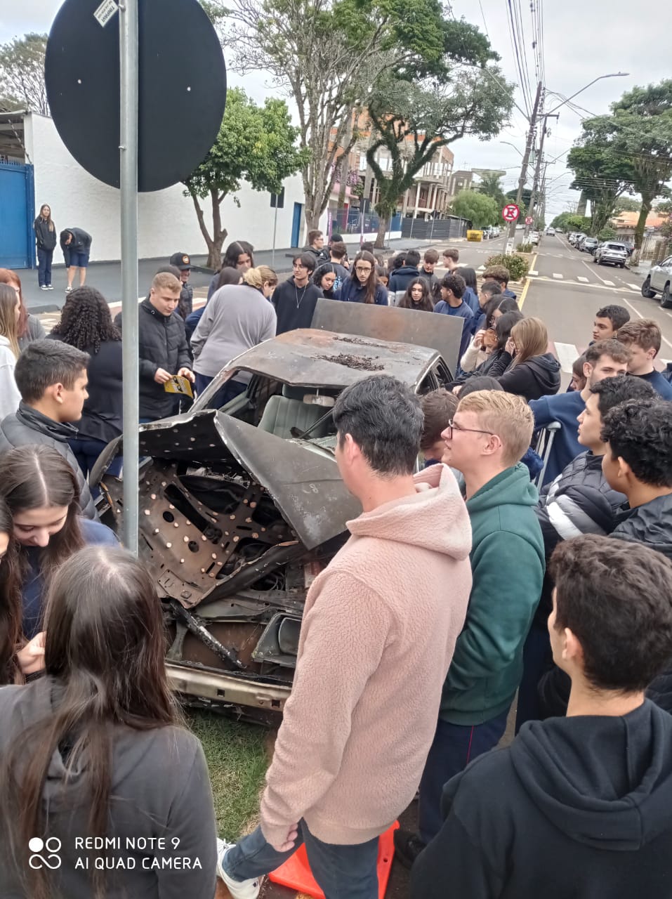 Nesta terça foi feita a exposição de um veículo batido para sensibilizar alunos e também motoristas que passavam frente a escola sobra importância do cuidado no trânsito em frente ao colégio Roland, no centro da cidade.