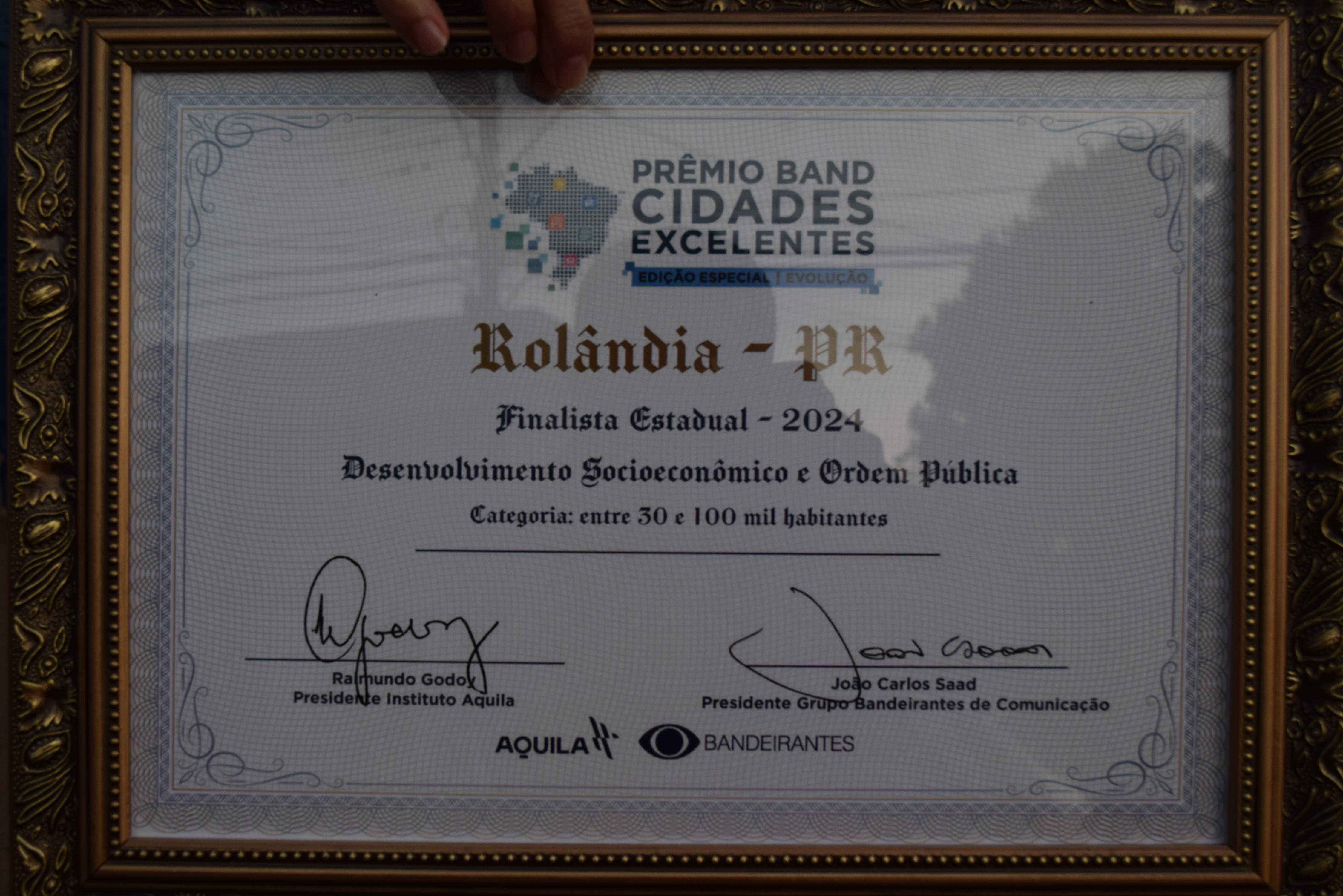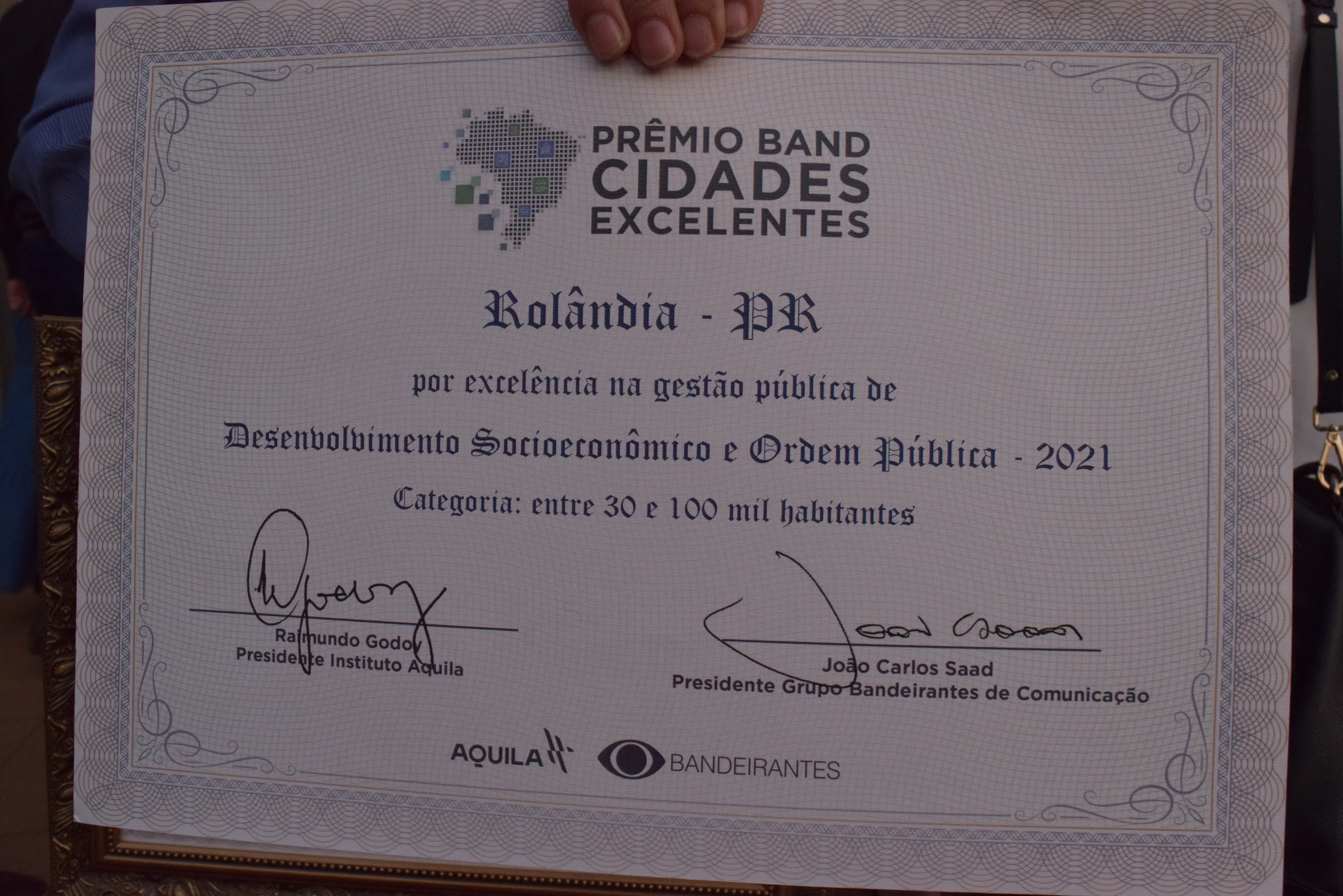 Na avaliação do Grupo Bandeirantes e do Instituto Áquila, promotores do prêmio ““BAND CIDADES EXCELENTES 2021/2024”, Rolândia se destacou no quesito “Desenvolvimento Socioeconômico e Ordem Pública” e o prefeito recebeu o prêmio de segundo lugar entre as cidade paranaenses entre 30 mil e 100 mil habitantes, com nota 70,82.