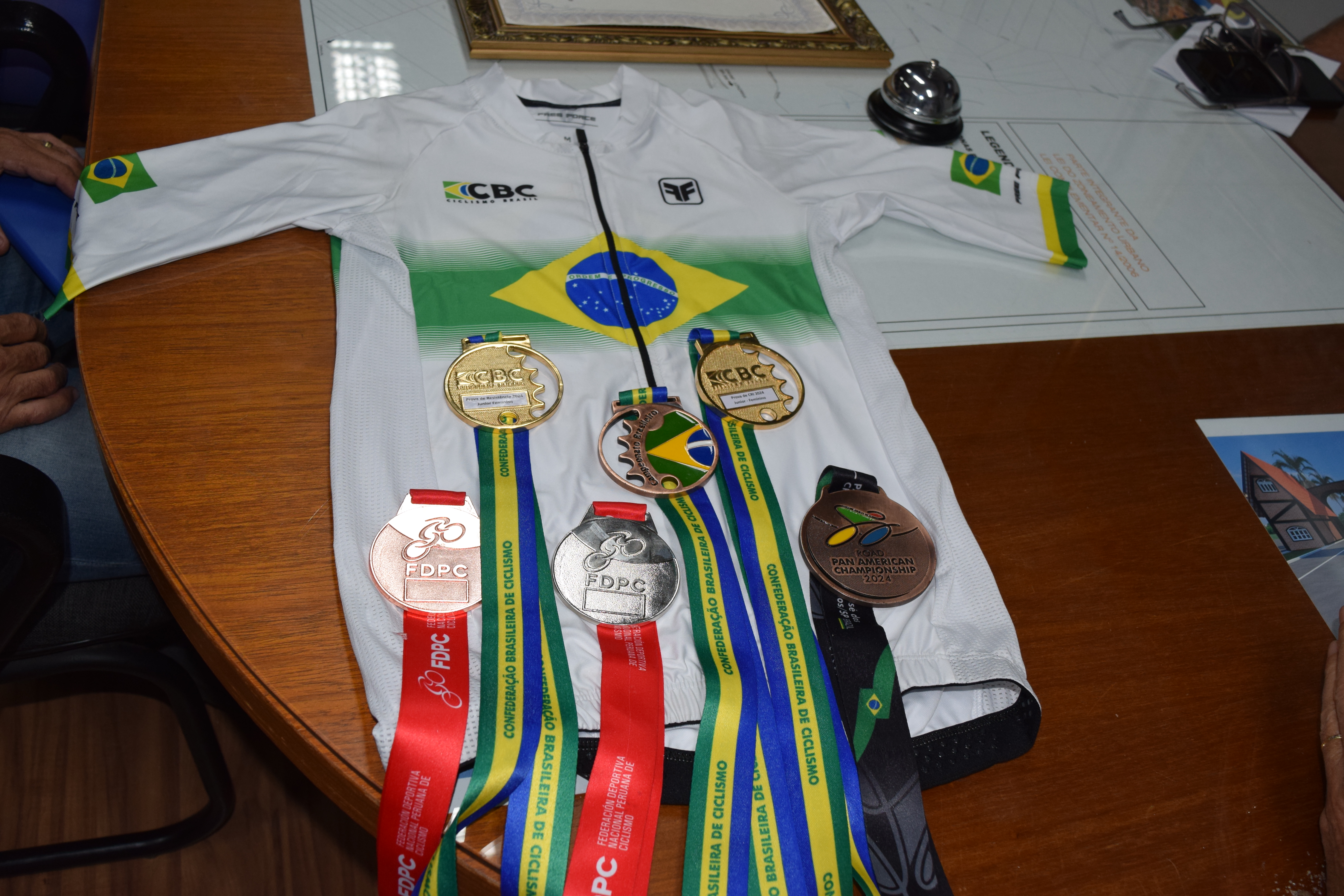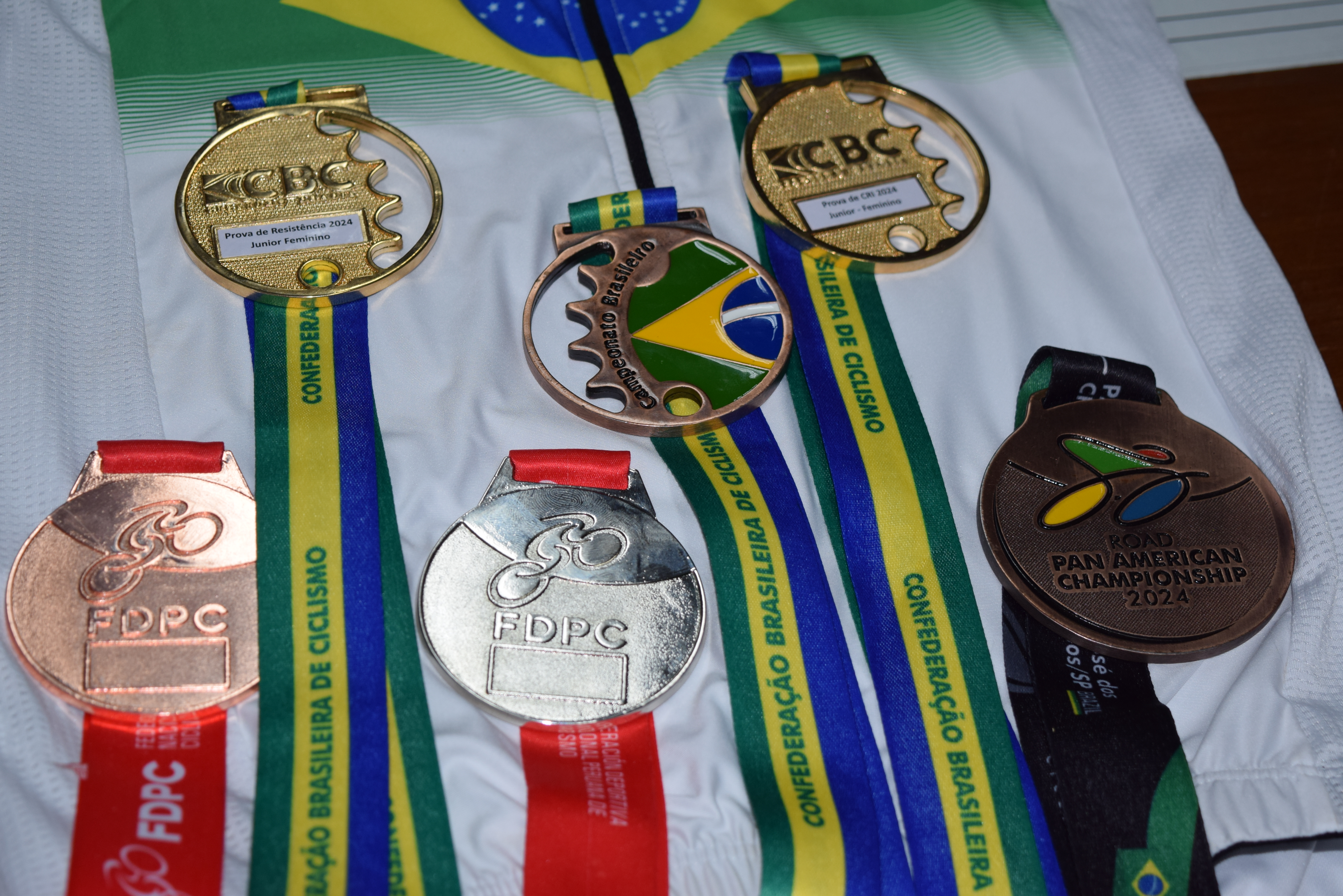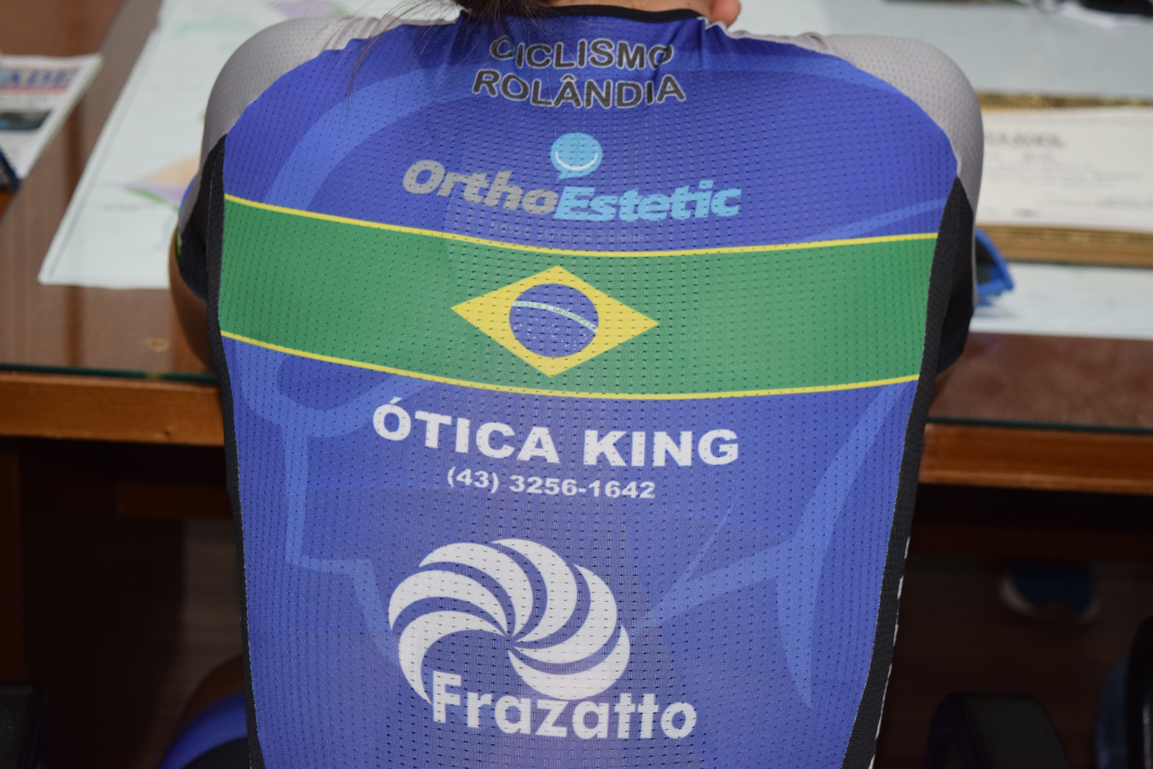Por ser campeã brasileira, ela ganhou uma camiseta branca, com a bandeira do Brasil, da Confederação Brasileira de Ciclismo, para que todos saibam que a atleta é a melhor do país!