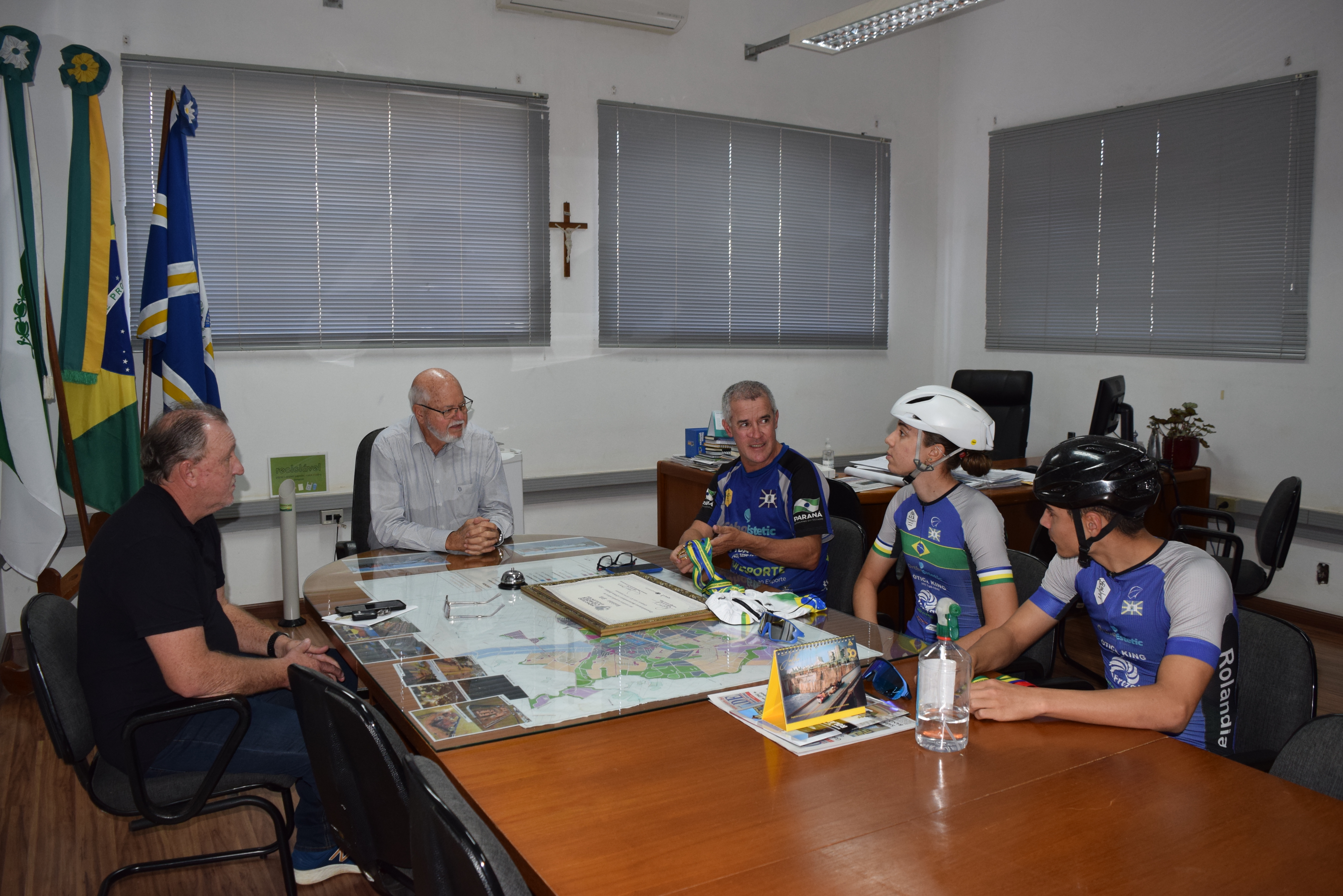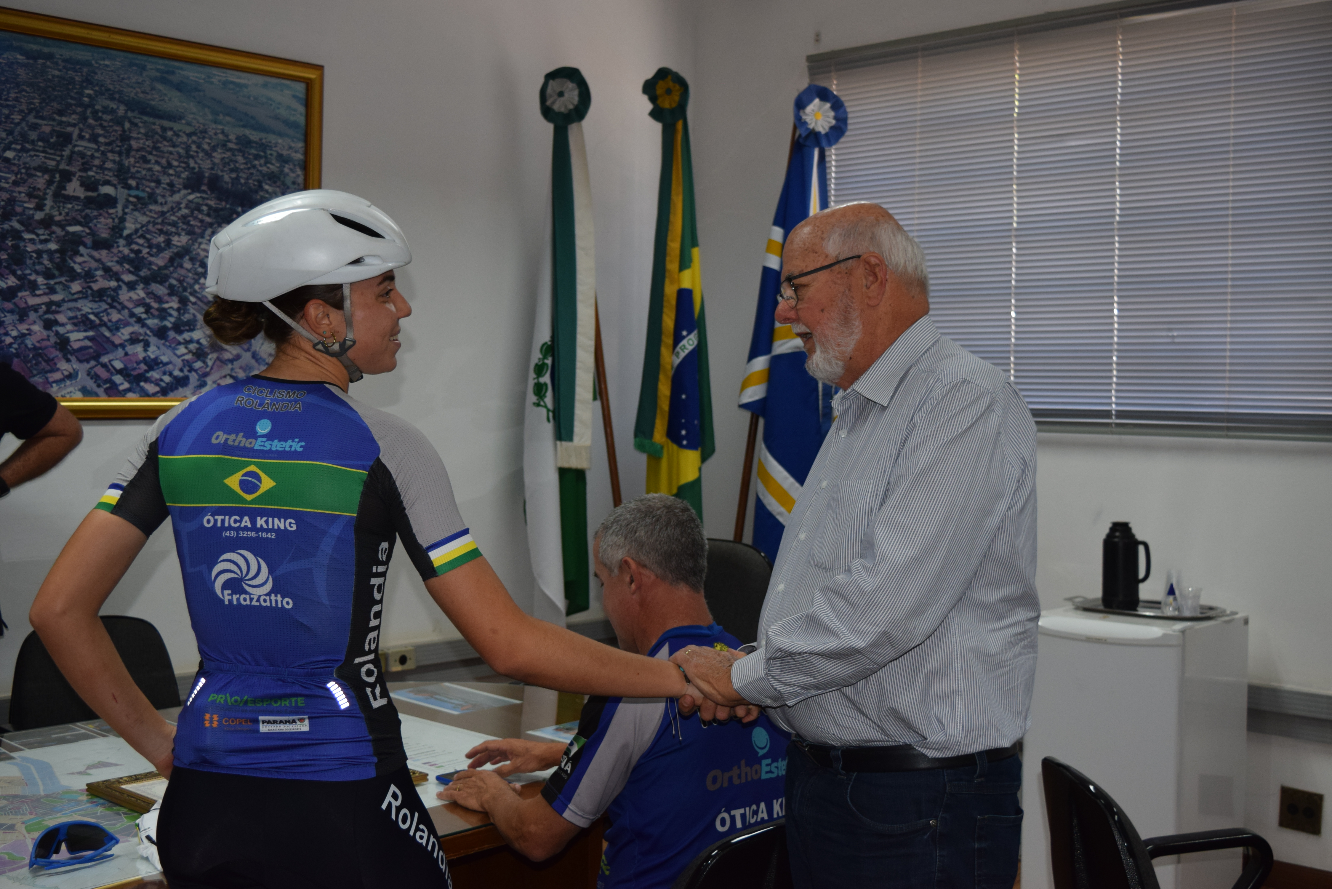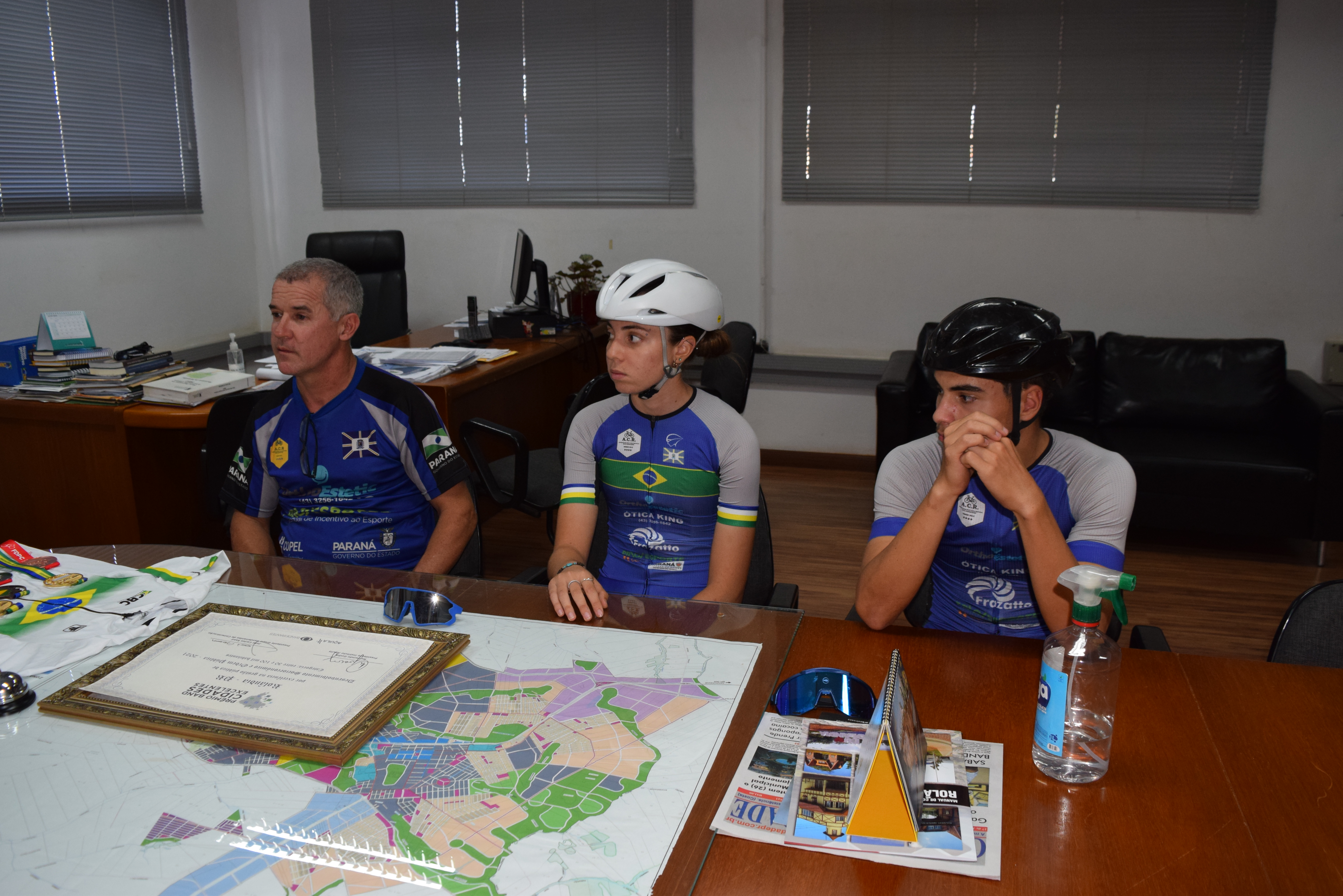 Nesta quarta-feira, dia 3 de julho, o prefeito Ailton Maistro e o secretário de Esportes, Odir Polaco, receberam no gabinete do prefeito, o técnico da equipe de ciclismo, da secretaria de Esportes, José Ricardo Moraes e os atletas Catharine Ehrmann Vieira e Matheus Constantino.