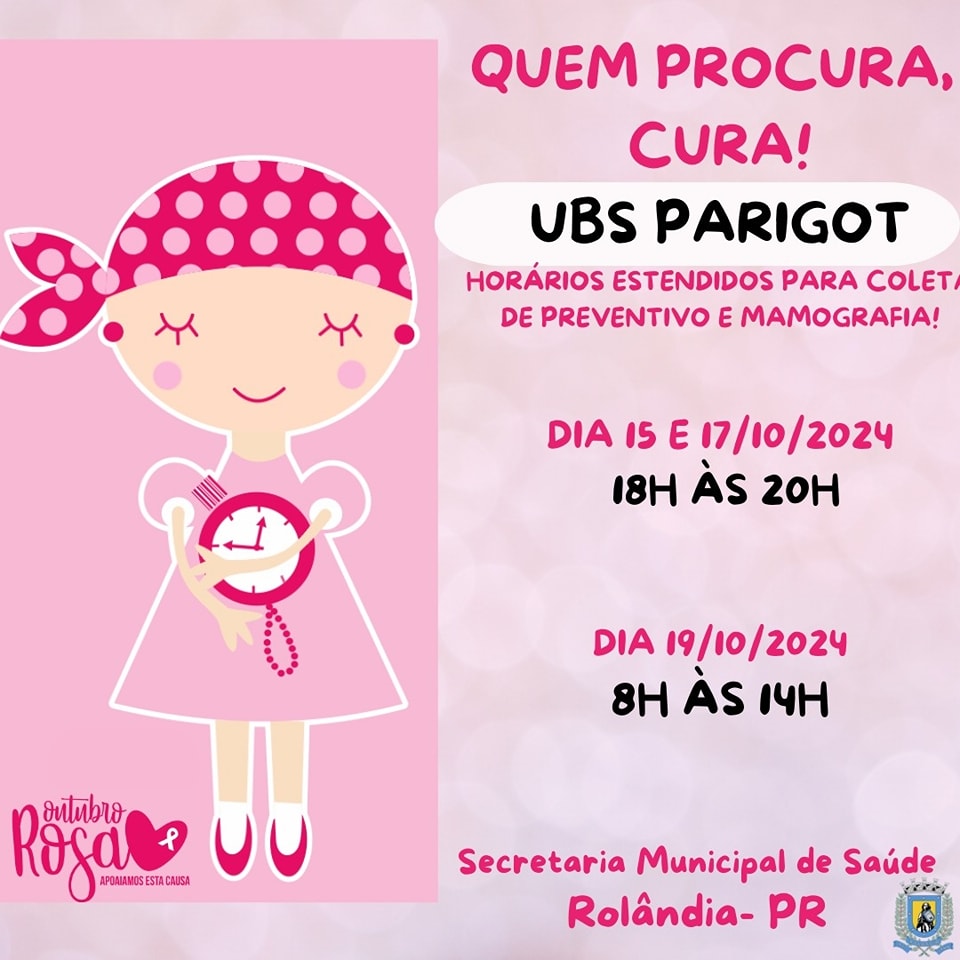 Contudo, para ampliar o horário de atendimento e oferecer a possibilidade da coleta de preventivo e o agendamento de mamografias aos sábados e no período noturno, a secretaria informa que as mulheres de Rolândia também serão atendidas: