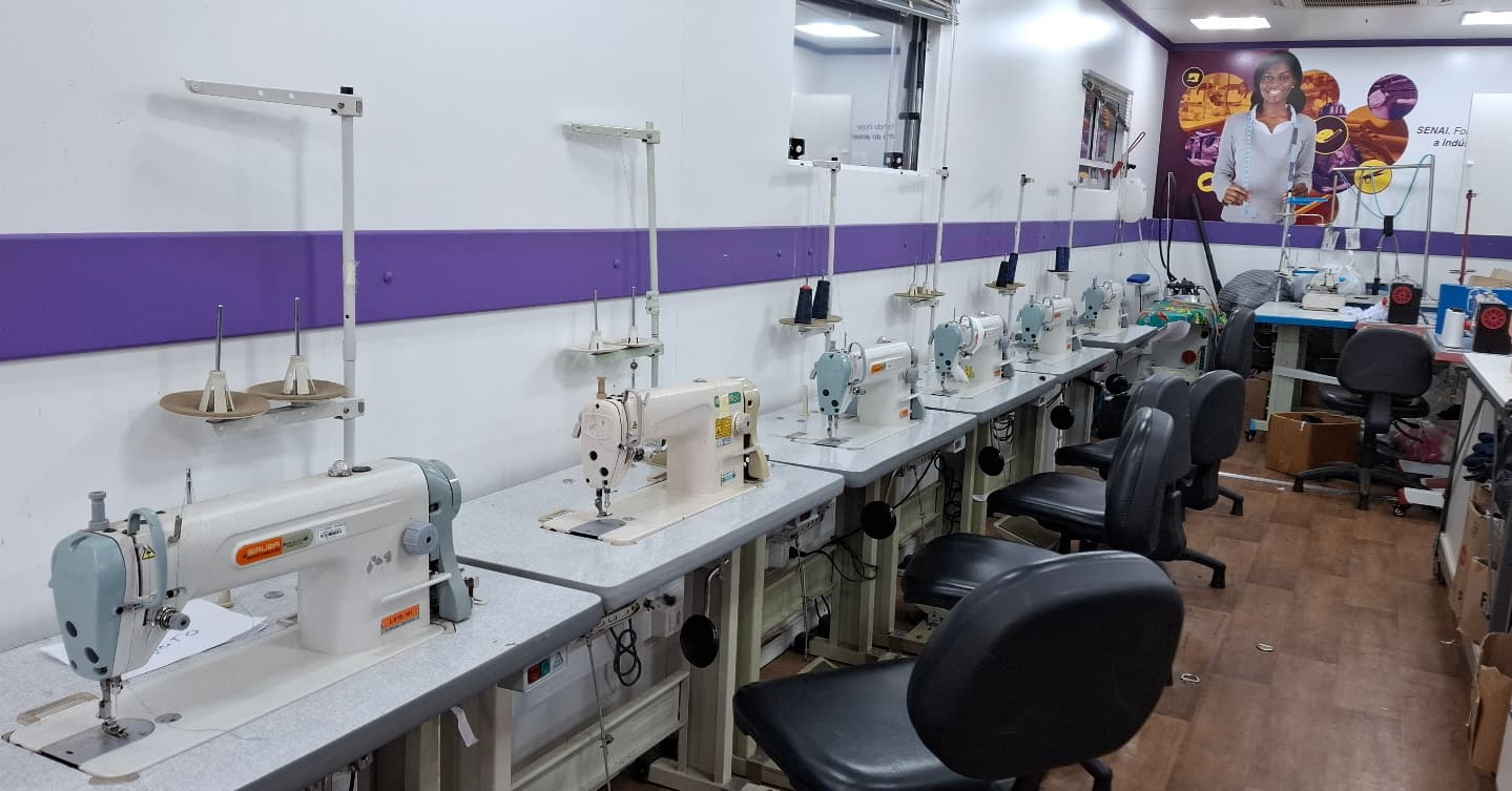 Ela está estacionada no pátio interno da Prefeitura e oferece capacitação para 40 alunos, em turmas de tarde e de noite, no curso de “Confecção”.