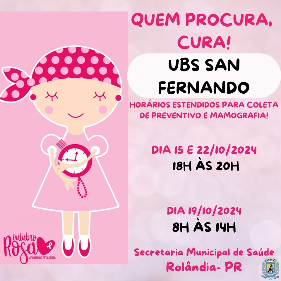 Contudo, para ampliar o horário de atendimento e oferecer a possibilidade da coleta de preventivo e o agendamento de mamografias aos sábados e no período noturno, a secretaria informa que as mulheres de Rolândia também serão atendidas: