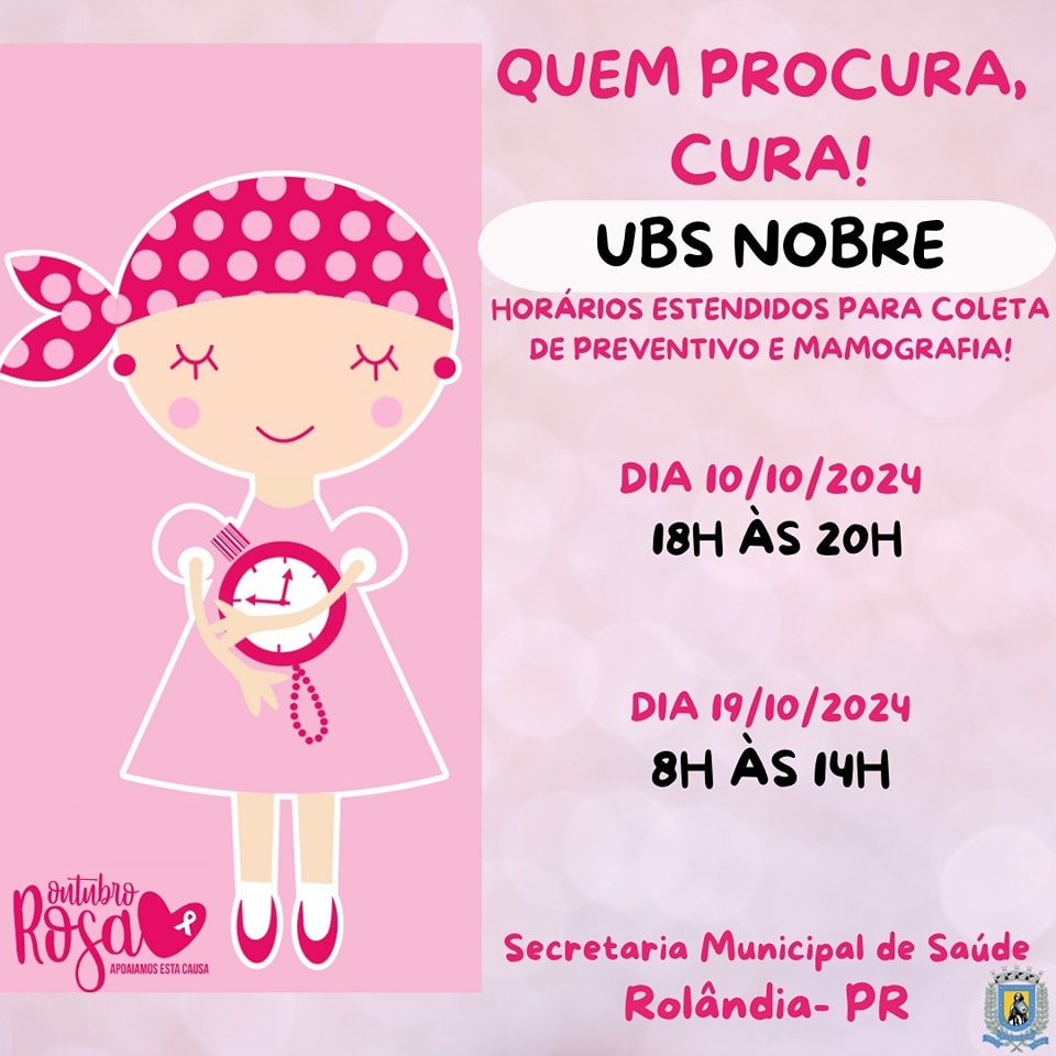 A secretaria de Saúde adotou para o “Outubro Rosa”, em Rolândia, o tema “Quem procura, cura!”.