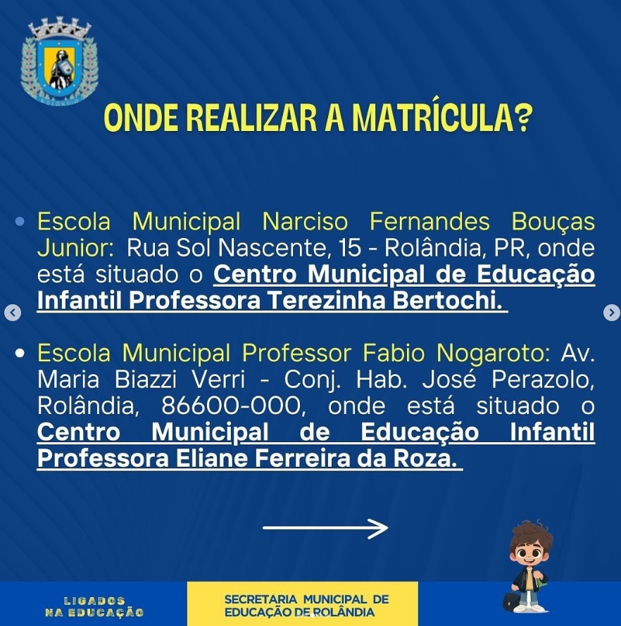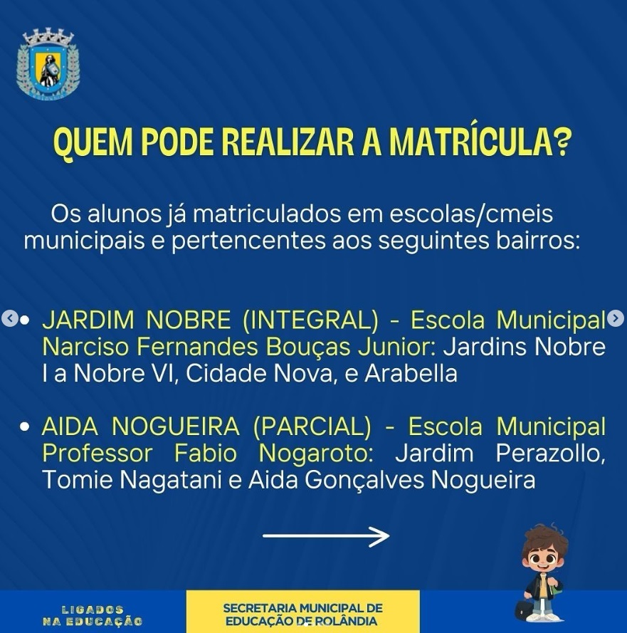 A secretaria de Educação informa que para o ano letivo 2025, a rede municipal vai ter duas novas escolas, que serão inauguradas em breve: uma no Jardim Nobre e outra no Áida Nogueira.