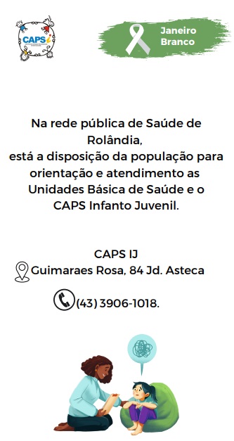 Na rede pública de Rolândia, está à disposição da população para orientação e atendimento as Unidades Básica de Saúde e o CAPS Infanto Juvenil que atende crianças a partir dos três 3 até os 18 anos com transtornos mentais graves e persistentes.