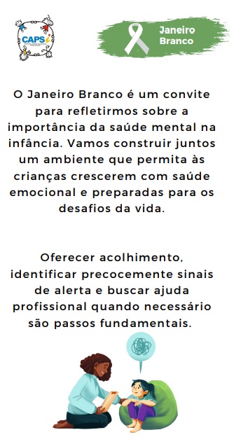 A secretaria de Saúde informa que o “Janeiro Branco” é uma campanha dedicada à conscientização sobre a saúde mental, incentivando reflexões e ações voltadas ao bem-estar emocional em todas as idades.
