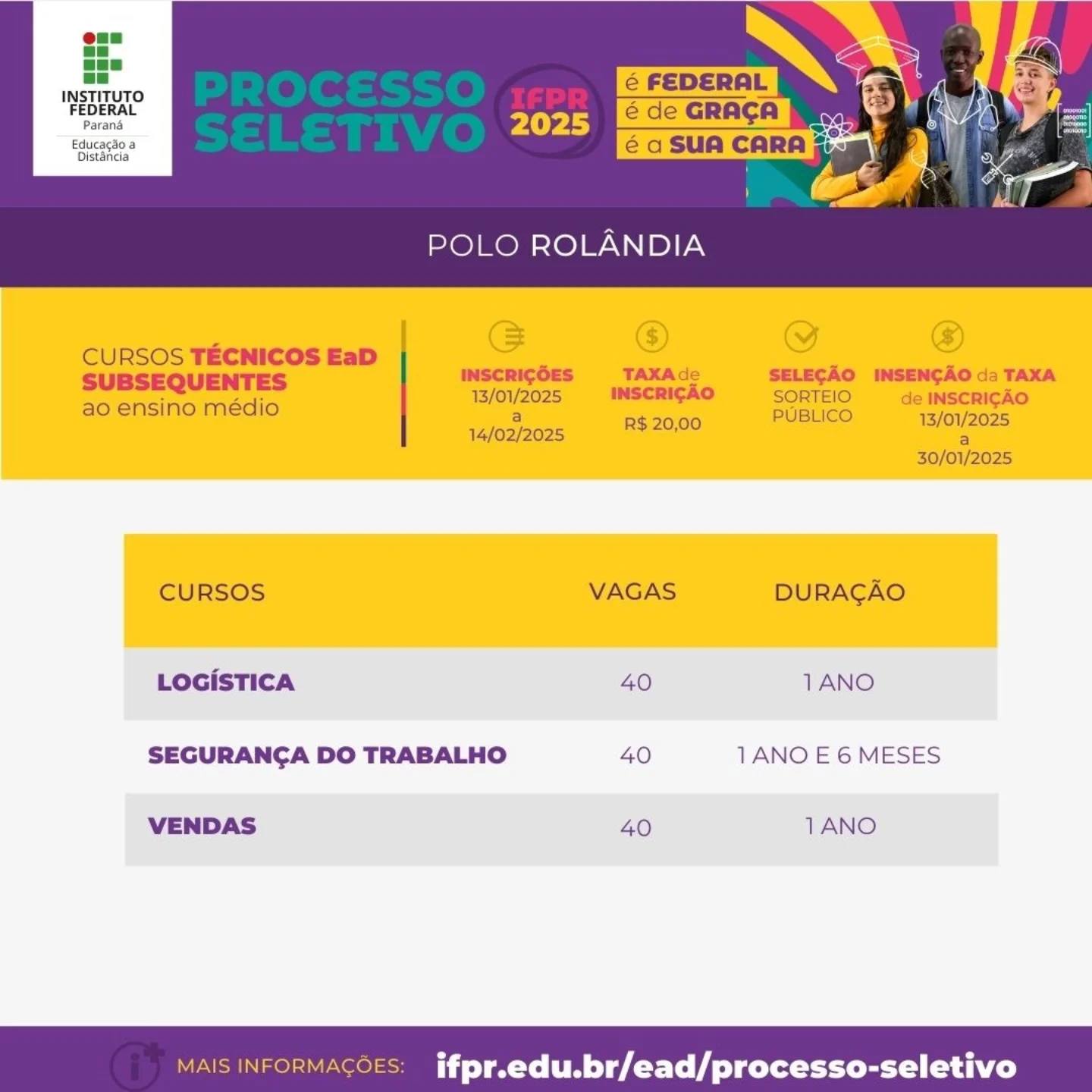 INSCRIÇÕES ABERTAS PARA CURSOS TÉCNICOS A DISTÂNCIA DO IFPR PARA MORADORES DE ROLÂNDIA